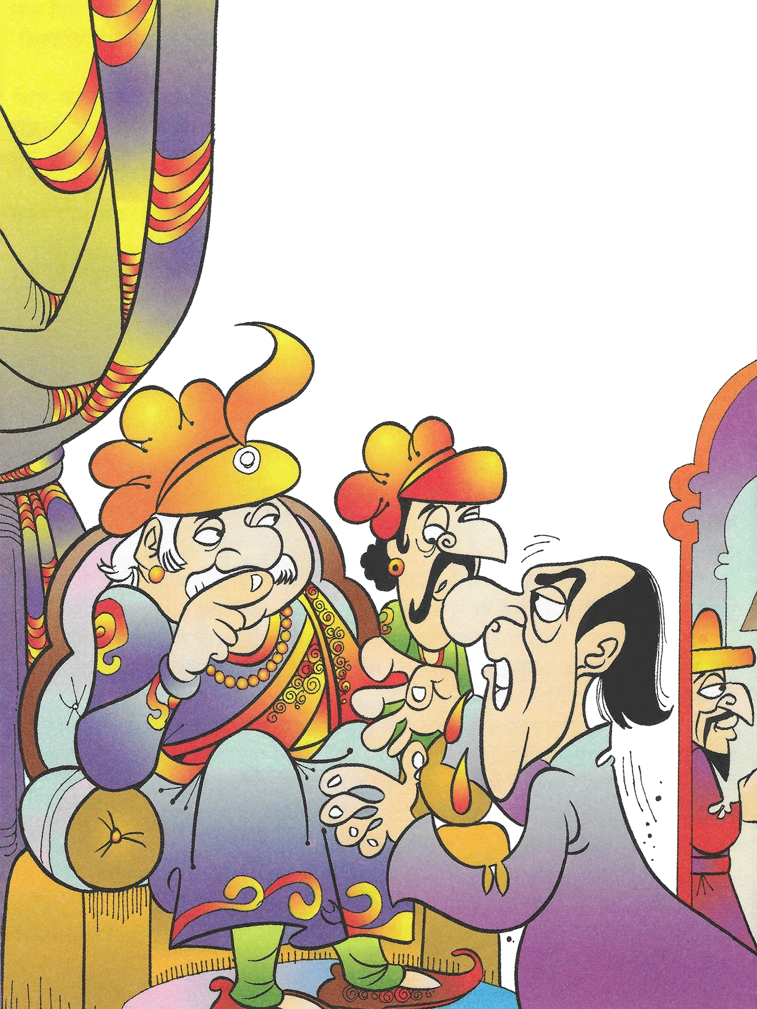 एक दिन दरबार में बादशाह अकबर ने बीरबल से कहा — “कोई ऐसा आदमी दरबार में पेश करो जिसके तीन रूप हों2।” “जी आलमपनाह3, कल प्रातः4 आपके हुक्म की तामील5 हो जाएगी।” बीरबल ने जवाब दिया। अगले दिन बीरबल दरबार में एक आदमी को लेकर आया और उसे एक प्याला शराब पिला6 दी। वह आदमी बोला — “हुज़ूर मुझे जाने दें7, मुझे क्यों पकड़कर लाया गया है ?” “हुज़ूर यह इसका तोता रूप है।” यह कहकर बीरबल ने एक प्याला शराब और8 दी, पीकर वह आदमी बोला — “हम9 दिल्ली के बादशाह हैं… तू10 कौन है, जो गद्दी11 पर बैठा है ?” “हुज़ूर यह इसका शेर रूप है।” बीरबल ने कहा और उसके बाद उसे एक प्याला शराब और पिलाई। इतनी शराब पीने के बाद वह आदमी ठीक से खड़ा भी नहीं रह सका और गिर पड़ा। तब बीरबल बोला — “हुज़ूर, यह इस आदमी का गधा रूप है।” बीरबल की बुद्धिमत्ता पर प्रसन्न हुए बादशाह अकबर। |