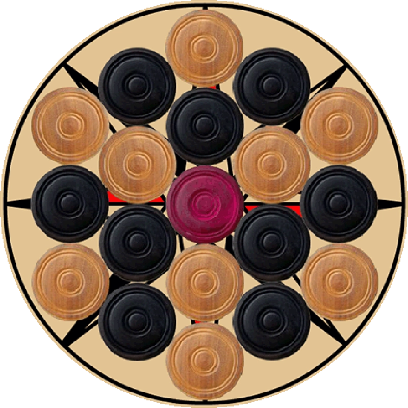On y joue à deux ou à quatre personnes. Au centre du plateau sont disposés, comme illustré sur la figure ci-contre, 9 pions blancs, 9 pions noirs et un pion rouge également appelé « reine ».