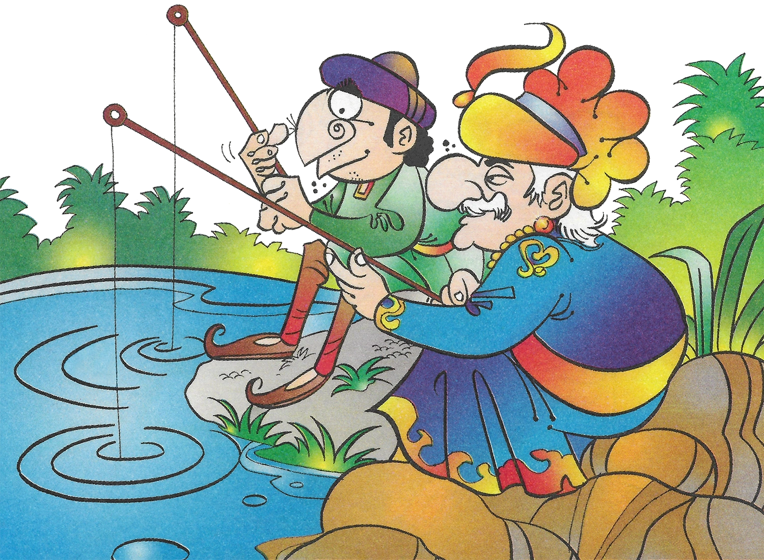 | अगले दिन बादशाह अकबर ने बीरबल से इस बारे में पूछा तो उसने जवाब दिया–“हुज़ूर, मैंने कोई गलत बात नहीं कही थी। आप मछली मारने बैठ गए इसलिए मैंने आपकी बेगम से कह दिया कि आप झक मार रहे हैं क्योंकि संस्कृत में मछली को झक कहा जाता है।” | Le lendemain, l’Empereur Akbar interrogea Birbal à ce sujet, alors il répondit : « Son excellence, je n’ai rien dit de faux. Vous vous êtes installé pour pêcher ; c’est pourquoi j’ai dit à votre épouse, la reine, que vous étiez en train d’attraper du poisson, car dans la langue sanskrite, le poisson se dit ‘jhak’1 » |