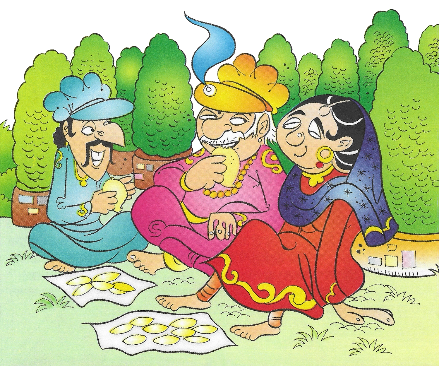 | bādaśāha akabara, unakī begama tathā bīrabala, tīnoṁ bāga meṁ baiṭhe āma khā rahe the। bādaśāha akabara ko mazāka sūjhā aura ve āma khākara usake chilake va guṭhaliyāṁ begama kī tarafa pheṁkane lage। | L’empereur Akbar, sa bégum et Birbal, assis tous trois dans un jardin, mangeaient des mangues. Une plaisanterie vint à l’esprit de l’Empereur : tout en mangeant ses mangues, il se mit à lancer ses pelures et ses noyaux en direction de la bégum. |