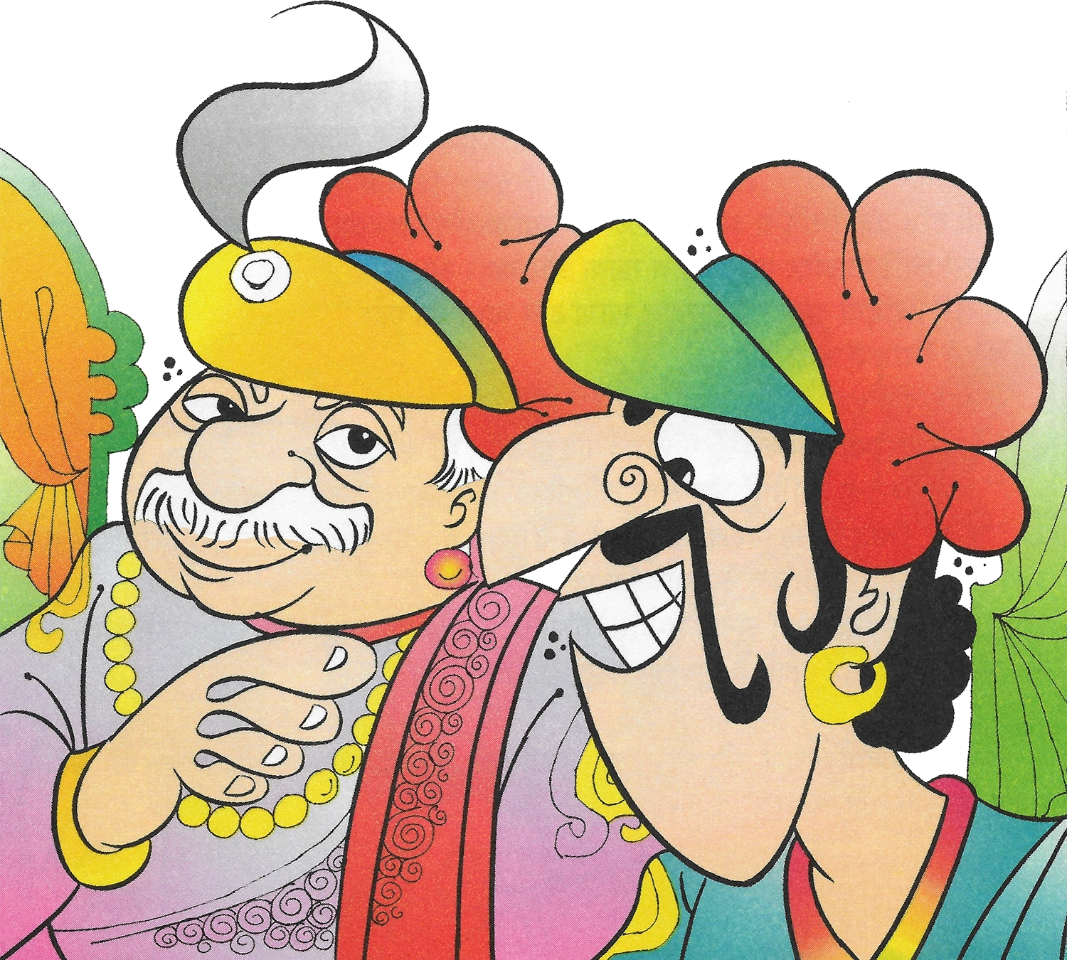| बादशाह अकबर ने बीरबल से कहा– “जिन लोगों के नाम अथवा उपनाम के अन्त में वान या बान लगा होता है वे लोग आम तौर पर कोई छोटा काम करने वाले ही होते हैं – जैसे दरबान कोचवान आदि। तुम्हारा क्या विचार है इस बारे में बीरबल?” | L’Empereur Akbar dit à Birbal : « Les gens dont le nom ou le surnom se termine par –vâne ou –bâne1, sont généralement ceux qui exercent un petit métier, comme, les portiers, darbâne, les cochers, cotchevâne, etc. Quel est ton avis à ce sujet, Birbal ? » |