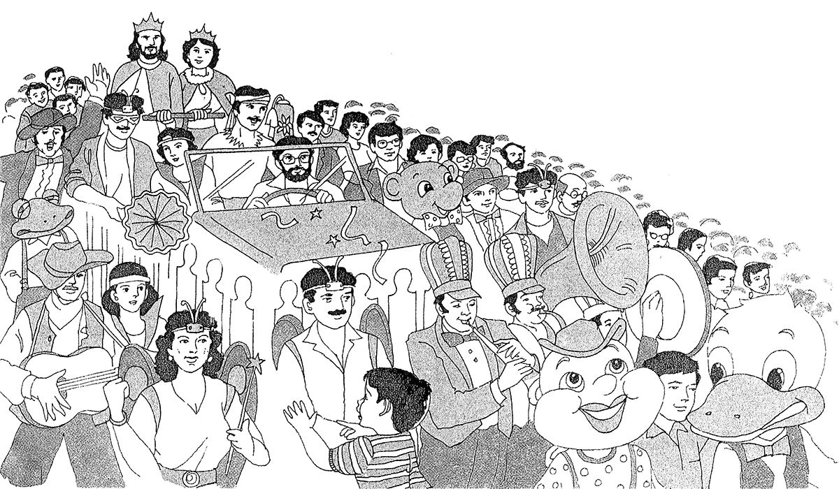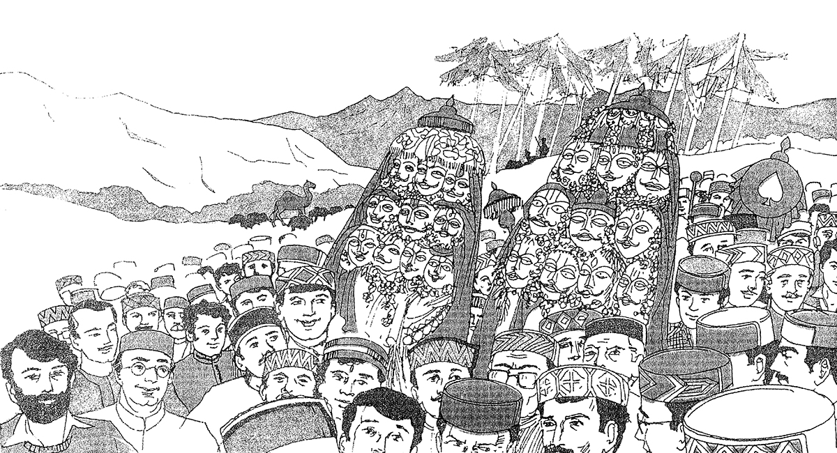 | यहाँ दशहरे के जुलूस का एक चित्र बना हुआ है। क्या तुम देखकर बता सकते हो कि इस चित्र में ऐसी क्या चीज़ है जो यहाँ के वातावरण से मेल नहीं खाती? | Voici le dessin d’une procession de la fête de Dasahara. En observant cette image, peux-tu repérer ce qui détonne dans le paysage ? |