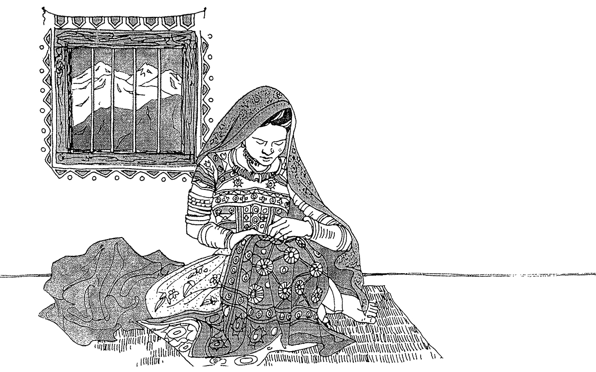 | इस तस्वीर में एक औरत कपड़े पर कढ़ाई कर रही है। बताओ, इस चित्र में क्या अजीब है? | Dans de dessin, une femme est en train de broder des vêtements. Dis ce qu’il y a d’étrange dans cette image. |