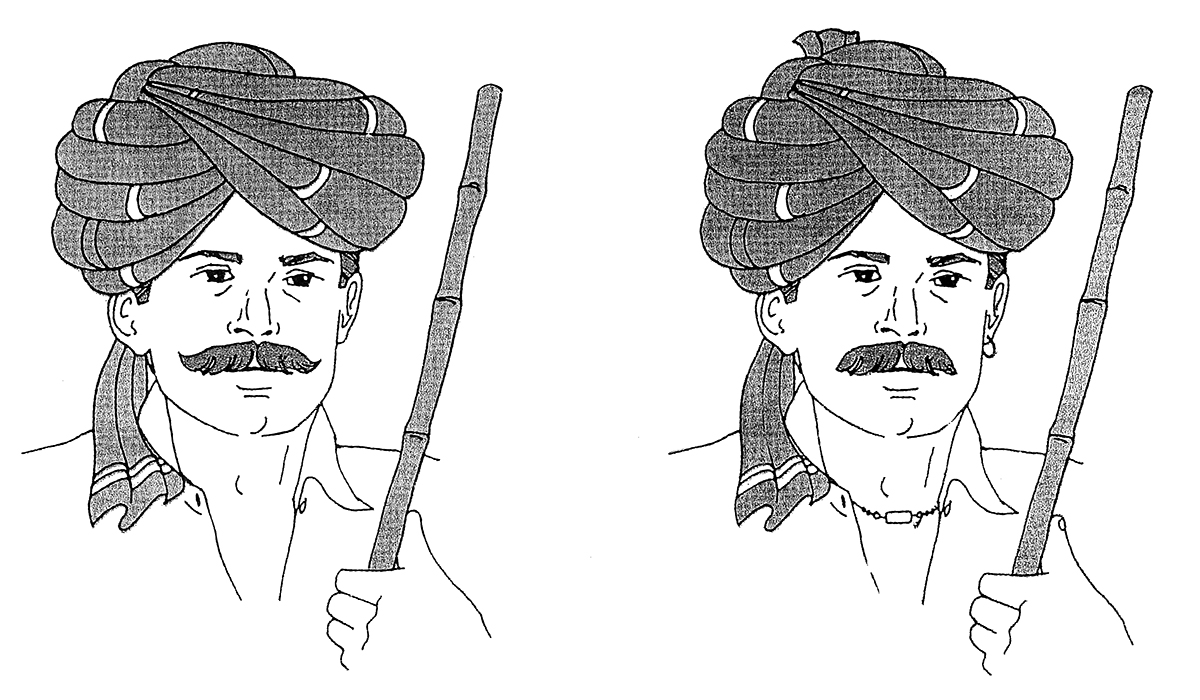 | इस चित्र में दिखाए गए हरियाणा के दो किसान कौन-कौन सी पाँच बातों में एक दूसरे से भिन्न हैं? | Dans cette image, on voit deux paysans Hariyanais. Quelles sont les cinq choses qui les différencient ? |