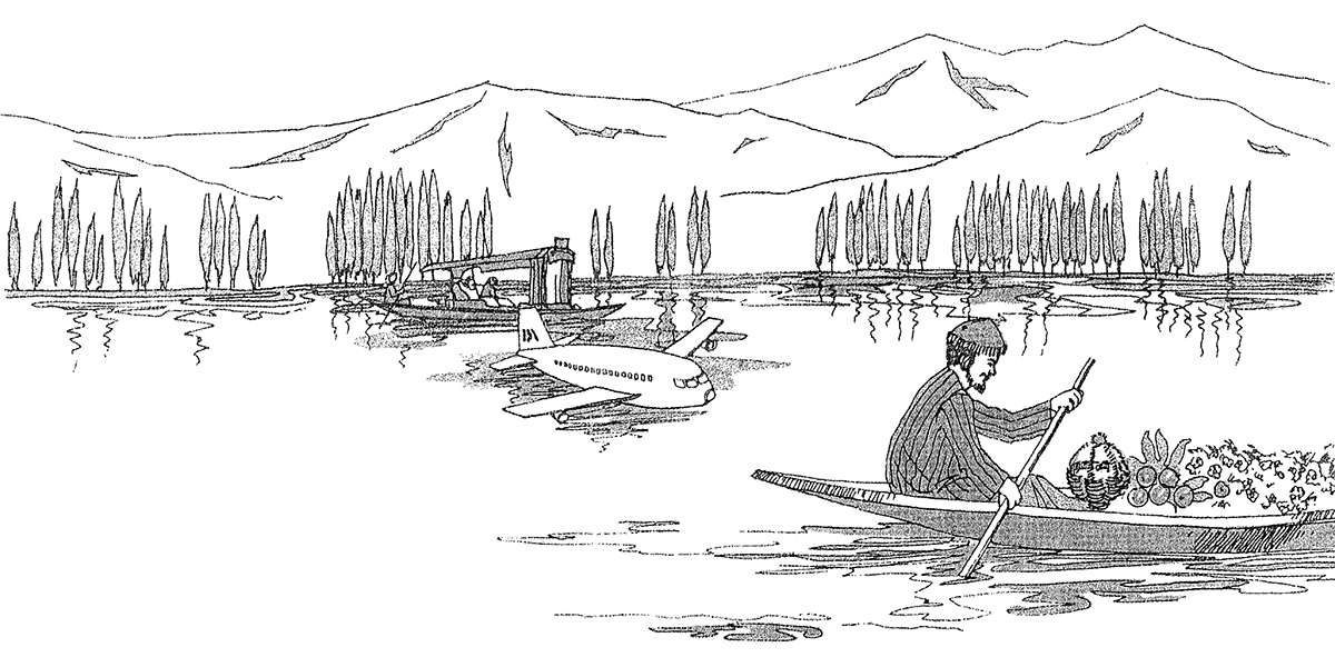 | शिकारा चलाते हुए कश्मीरी नाविक के इस चित्र में बताओ कि इसमें कौन-सी चीज़ है जो यहाँ नहीं होनी चाहिये। | Dis-nous quel est l’intrus dans cette image représentant le batelier cachemiri qui pilote la « shikara » (longue barque traditionnelle) ! |