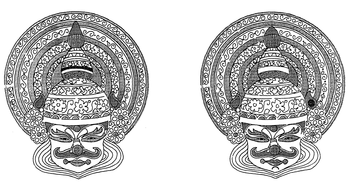 | कथकलि के इन दो मुखौटों में पांच अंतर खोजो। | Trouve les cinq différences entre ces deux masques de Kathakali. |