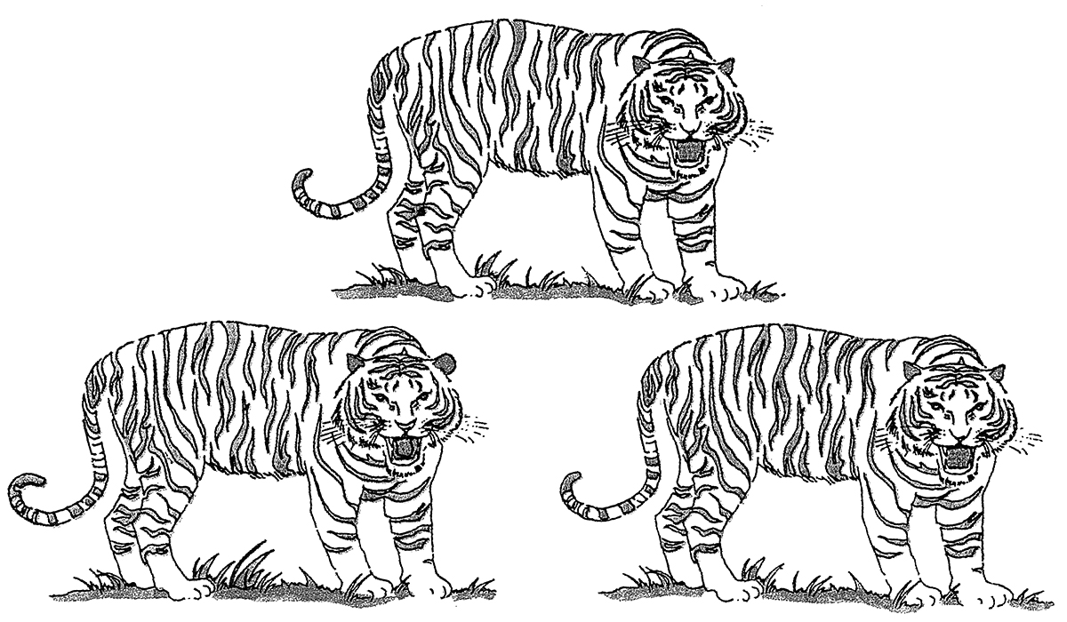| क्या तुम बता सकते हो कि यहाँ दिखाए गए शेरों में कौन-से दो एक जैसे हैं? | Parmi les tigres illustrés ici, quels sont les deux identiques ? |