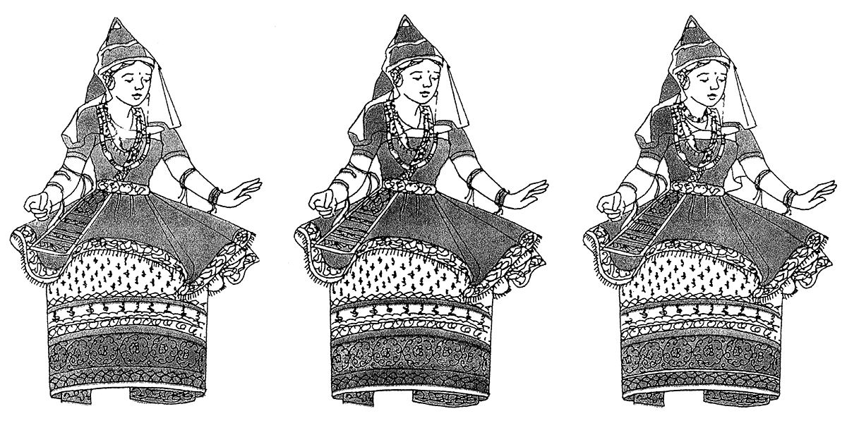 | इस तस्वीर में तीन मणिपुरी स्त्रियाँ बहुत सुंदर वेशभूषा में हैं। कौन-सी दो स्त्रियों की वेशभूषा बिल्कुल एक-सी है? | Sur cette image, trois femmes manipuries sont revêtues de tenues somptueuses. Lesquelles de ces deux danseuses portent des vêtements absolument identiques ? |