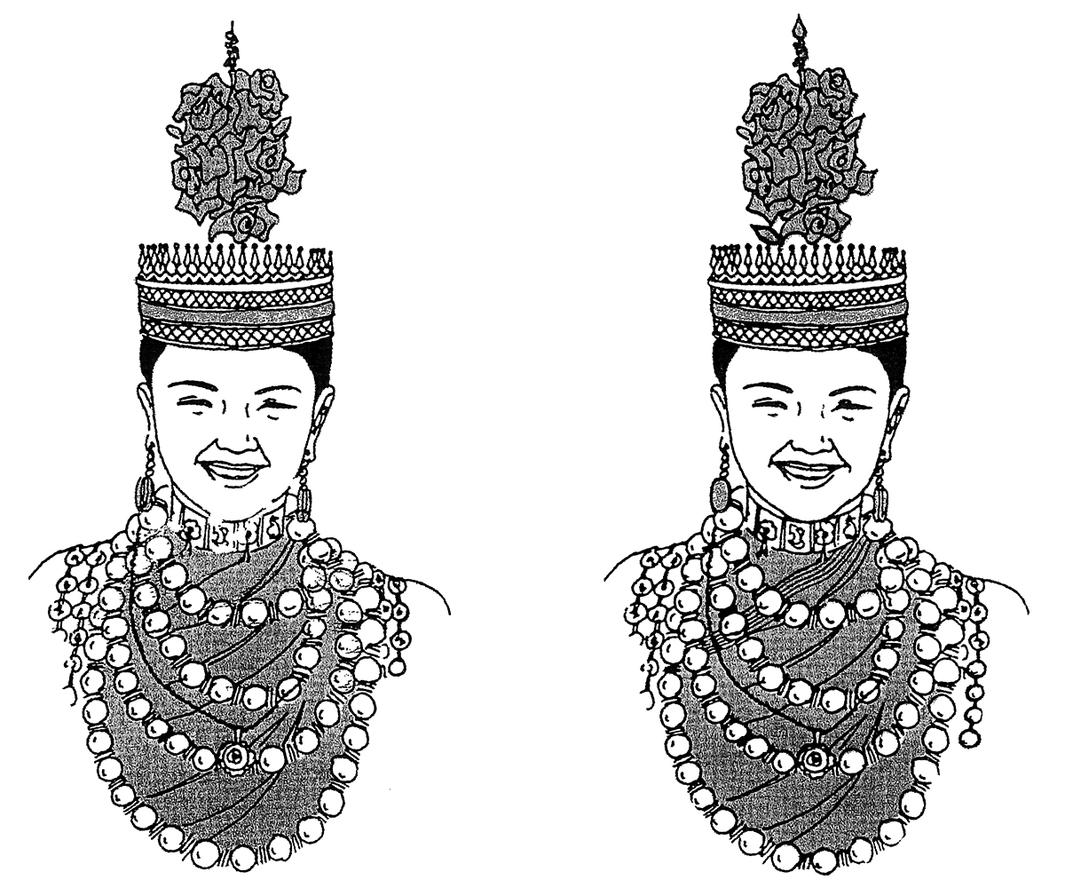| इस चित्र में दो खासी स्त्रियाँ परंपरागत वेशभूषा में हैं। उनके सिर पर फूलों से बनी टोपियाँ हैं। क्या इनकी पोशाक में पाँच अंतर बता सकते हो? | Dans cette image, deux femmes khasis sont en costume traditionnel. Sur la tête, elles portent des chapeaux de fleurs. Peux-tu indiquer les cinq différences dans leurs tenues vestimentaires ? |