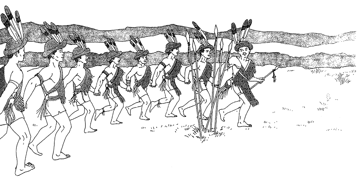 | नागालैंड के नागा आदिवासी खूंखार और बहादुर होते हैं। वे तेज़ धारवाले हथियारों से लड़ते हैं। शांति के समय वे हथियारों को छोड़ हाथों में हाथ डालकर नाचने लगते हैं। | Les indigènes de l’État du Nagaland, les Nagas sont des « coupeurs de têtes ». Ils sont aussi intrépides. Ils combattent avec des lances acérées. Lorsqu’ils font la paix, ils abandonnent leurs armes et se mettent à danser en se tenant par la main. |
