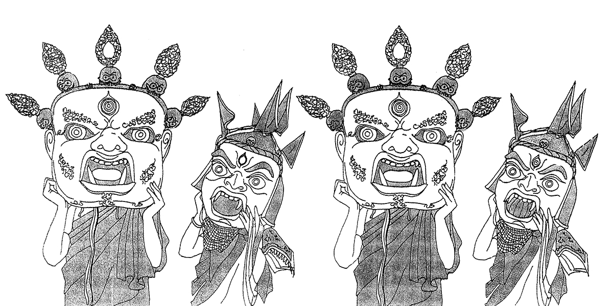 | इस चित्र में चार बौद्ध लामा वहाँ का मशहूर मुखौटा नृत्य कर रहे हैं। क्या तुम बता सकते हो कि इनमें से कौन-से दो नर्तक एक जैसा मुखौटा पहने हुए हैं? | Dans cette illustration, quatre lamas bouddhistes exécutent la célèbre danse des masques. Peux-tu distinguer parmi eux quels deux danseurs portent un masque identique ? |