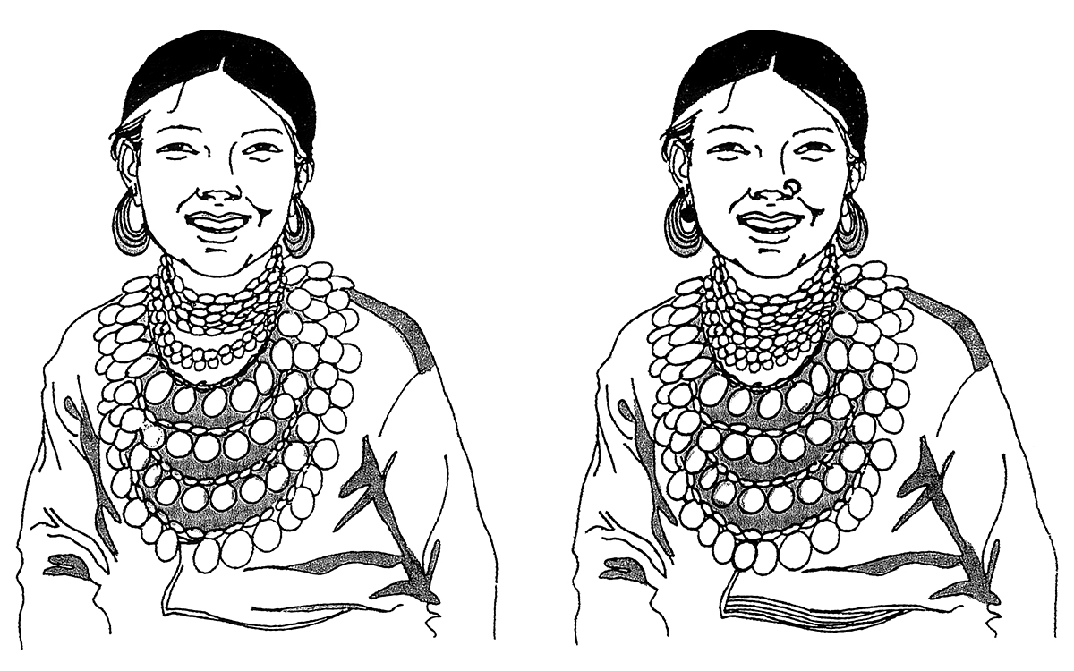 | ये दो आदिवासी स्त्रियाँ देखने में एक-सी अवश्य लगती हैं, पर एक जैसी हैं नहीं। इन दोनों की वेशभूषा में कौन से पाँच अंतर हैं? | En observant ces deux femmes aborigènes, on a l’impression qu’elles sont identiques, mais elles ne le sont pas. Trouve les cinq différences dans la tenue vestimentaire de ces deux femmes. |