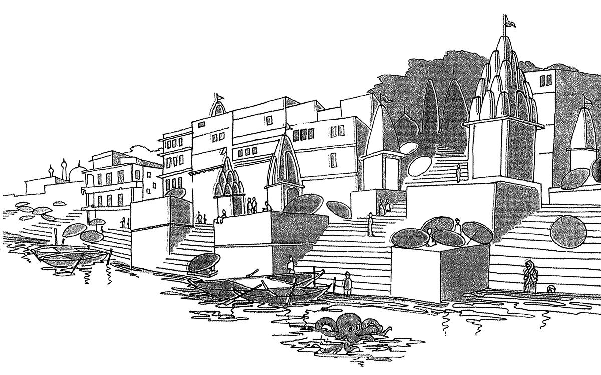 | वाराणसी के घाट के इस चित्र में ऐसी क्या चीज़ है जो इससे मेल नहीं खाती? | Dans cette image des ghats de Varanasi, quel est l’intrus ? |