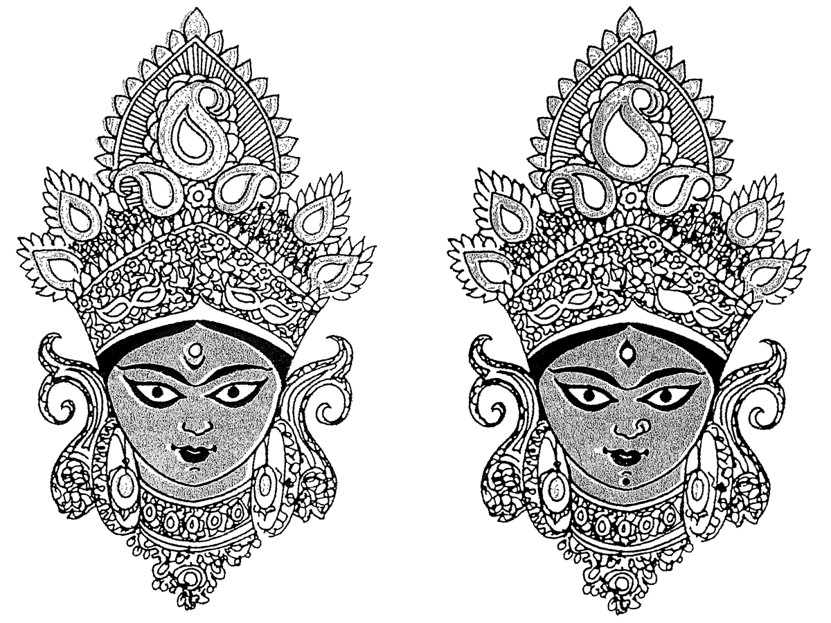 | इस चित्र में देवी दुर्गा के दो चेहरे हैं। देखने में दोनों चेहरे एक-से लगते हैं, पर इसमें पाँच अंतर हैं। बताओ कौन-कौन से हैं? | Il y a deux visages de la déesse Durga sur cette image. A première vue, les deux visages semblent identiques, mais il y a cinq différences entre elles. Lesquelles ? |
