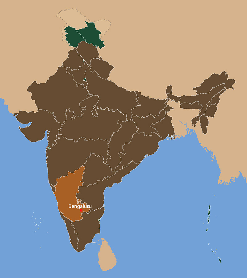 | इस राज्य में उद्योग ही उद्योग हैं। देश भर में सोने की सबसे अधिक खानें इसी राज्य में हैं। देश में जितना रेशम बनाया जाता है, उसका आधा भाग कर्नाटक राज्य में ही बनता है। कर्नाटक अपने महलों, मंदिरों और पत्थर की मूर्तियों के लिये भी मशहूर है। नरसिंह की २२ फ़ुट् ऊँची मूर्ती भी यहीं है। | Dans cet État, il y a seulement de nombreuses industries. Les plus abondantes mines d’or de tout le pays se trouvent dans cet État. La moitié de la soie produite en Inde provient de l’État du Karnataka. Celui-ci est également célèbre pour ses palais, ses temples et ses statues en pierre. C’est également là que se trouve la statue de Nara-simha (« homme-lion »), haute de 200 mètres ! |
