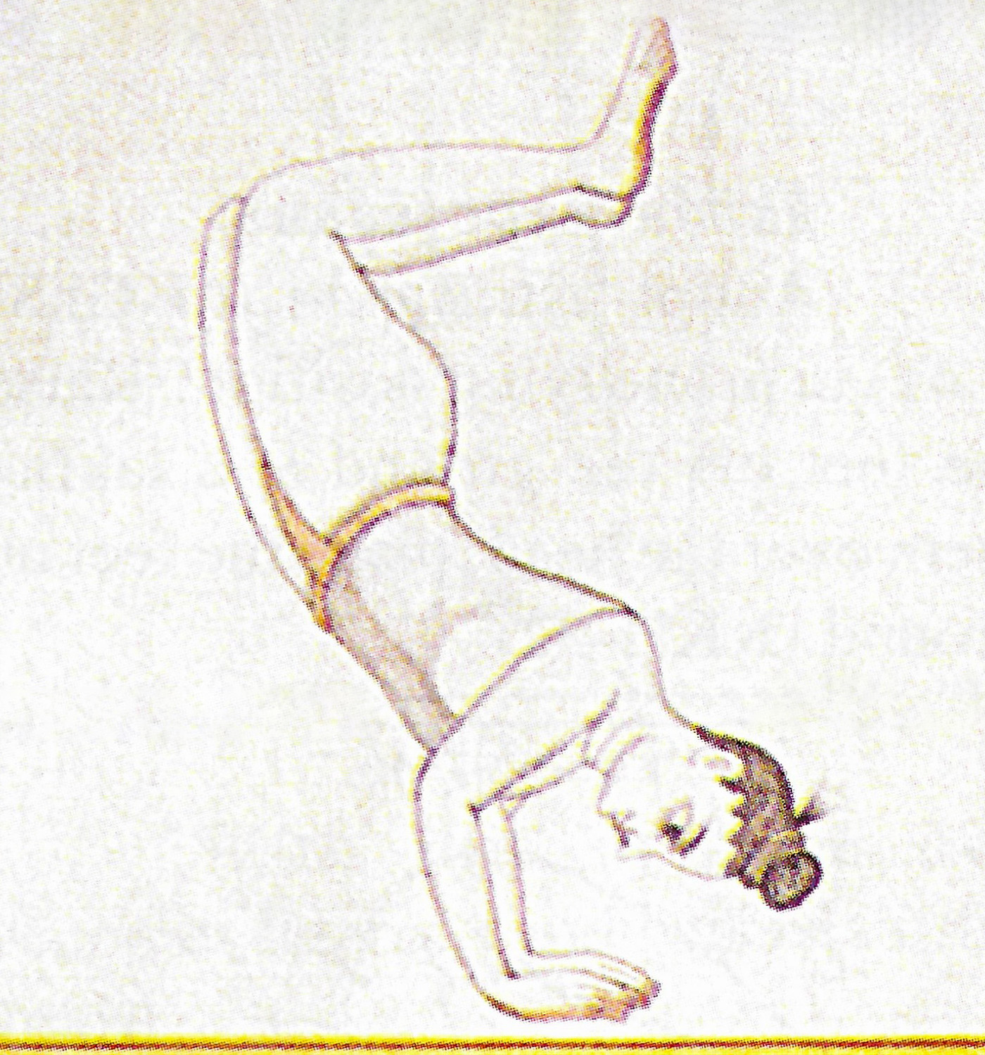 Adopter la posture gajāsana (à plat ventre, puis sur les mains et les orteils). Lancer les jambes en l’air et poser le front au sol (position du poirier). |