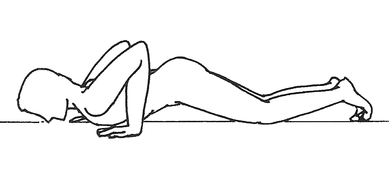 S’allonger sur le ventre et garder huit points de contact au sol : les deux pieds, les deux genoux, les deux mains, la poitrine et le front. L’abdomen ne doit pas toucher le sol et doit rester en l’air. Autre nom : अष्टांग नमस्कार (aṣṭāṁga namaskāra). |