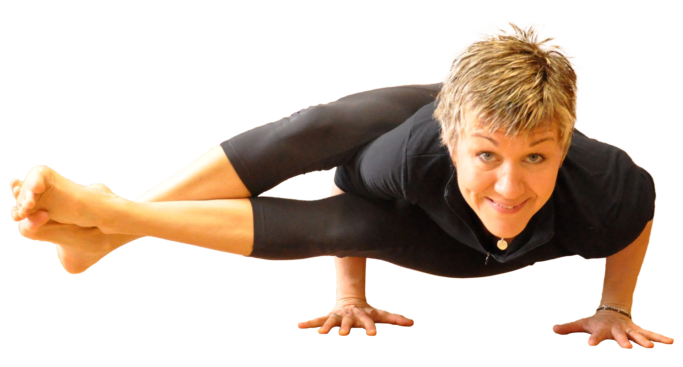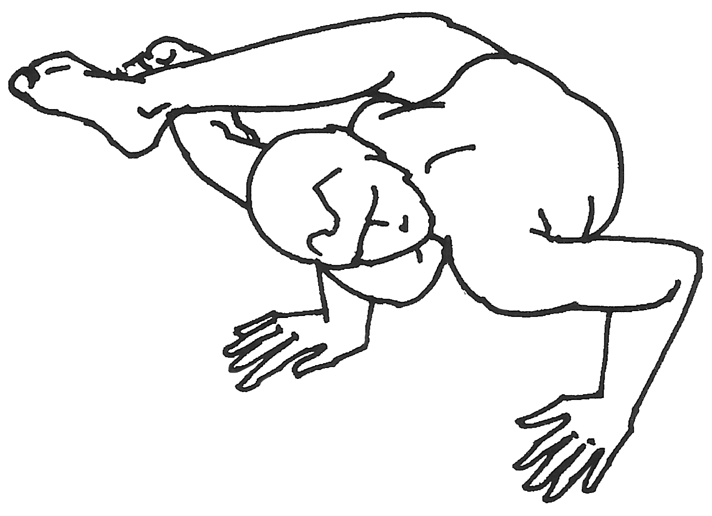 Insérer la main droite entre les cuisses et placer les mains fermement par terre. Pencher la tête en avant et lever fesses et jambes. Puis, après avoir croisé les pieds, tourner les jambes vers la droite. Tourner la tête vers la gauche. Recommencer dans la postion miroir. Posture similaire : kauṇḍinyāsana. |