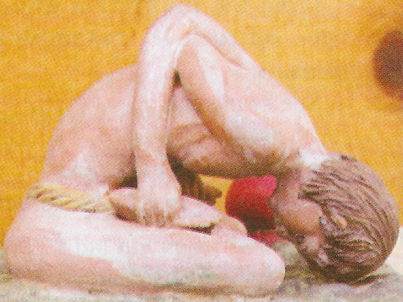 Variante n°2 : Les mains tiennent les pieds par dessous sans se croiser. Le buste est penché en avant et la tête touche le sol. Identique à padmāsana (variante n°10). |