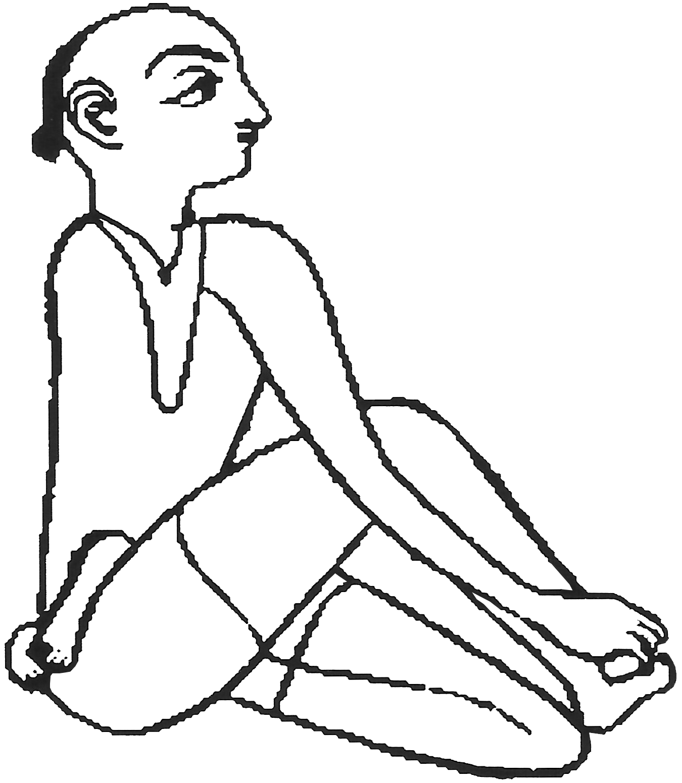 Assis au sol, positionner le pied gauche à la racine de la cuisse droite. Entourer le genou gauche du pied droit. Tenir le pied droit de la main opposée. Tourner le corps vers la doite et agripper la cuisse gauche par derrière. Posture similaire à matsyendrāsana (variante n°1). |
