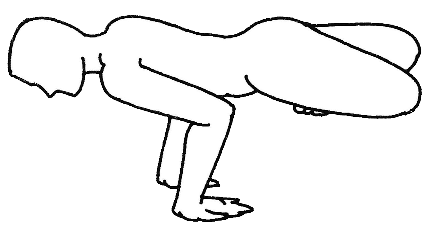 Cette posture combine celles de padmāsana et de mayūrāsana (dont c’est aussi la variante n°4) : les jambes sont repliées croisées et les mains posées au sol tiennent le corps en l’air. |