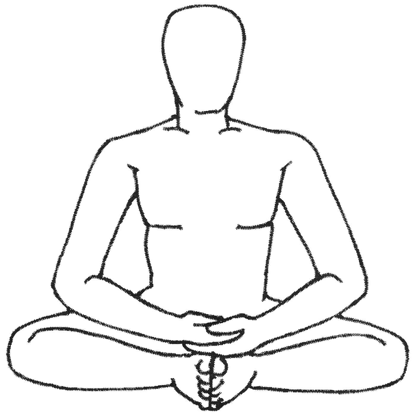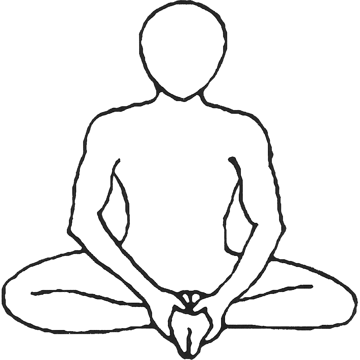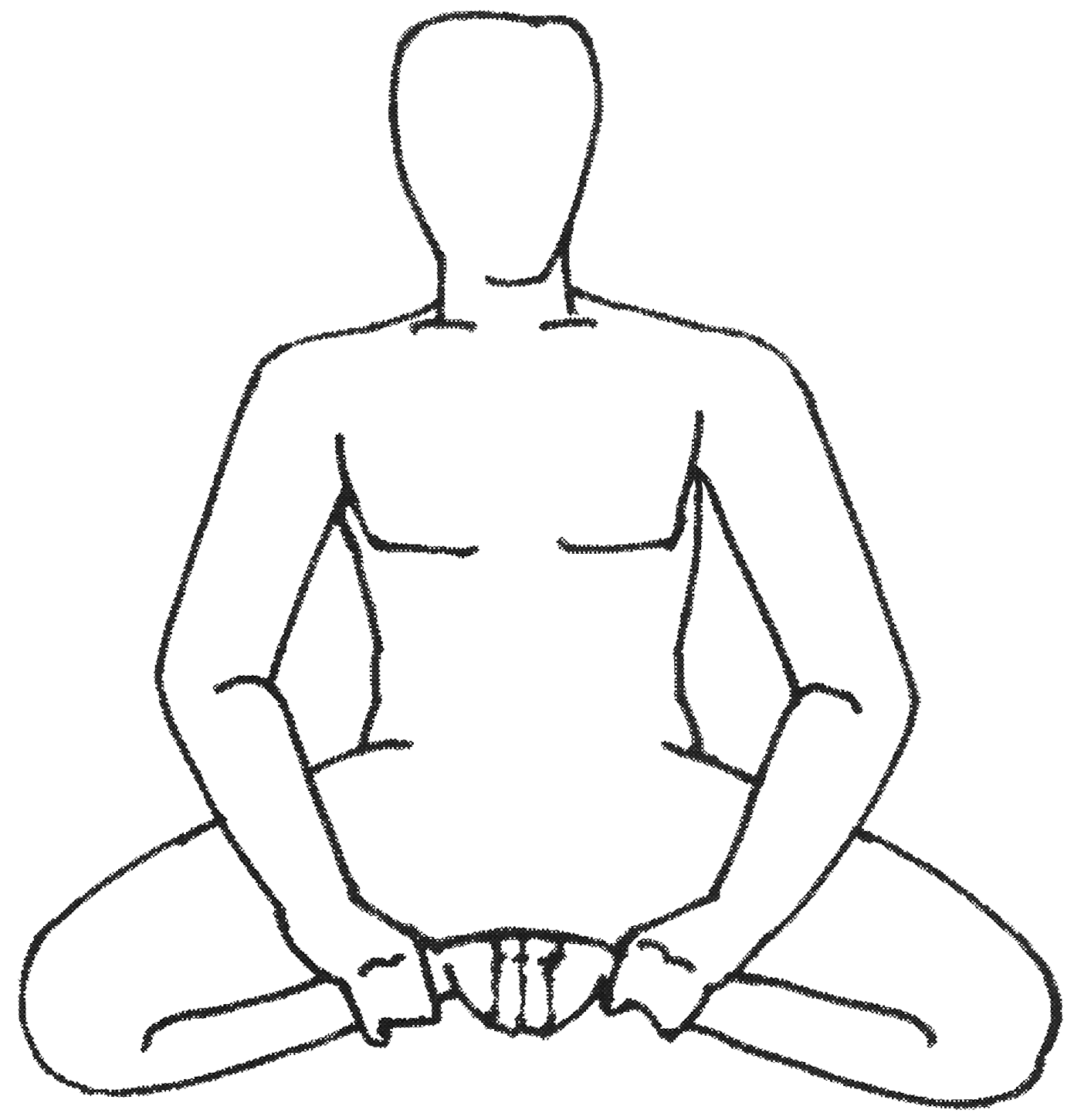 Variante n°1 : Assis au sol, placer les chevilles sous le scrotum de part et d’autre du périnée, la cheville gauche du côté gauche et la cheville droite du côté droit. Tenir fermement les pieds avec les mains. Autres noms : baddhakoṇāsana ou gorakṣāsana (variante n°6). |