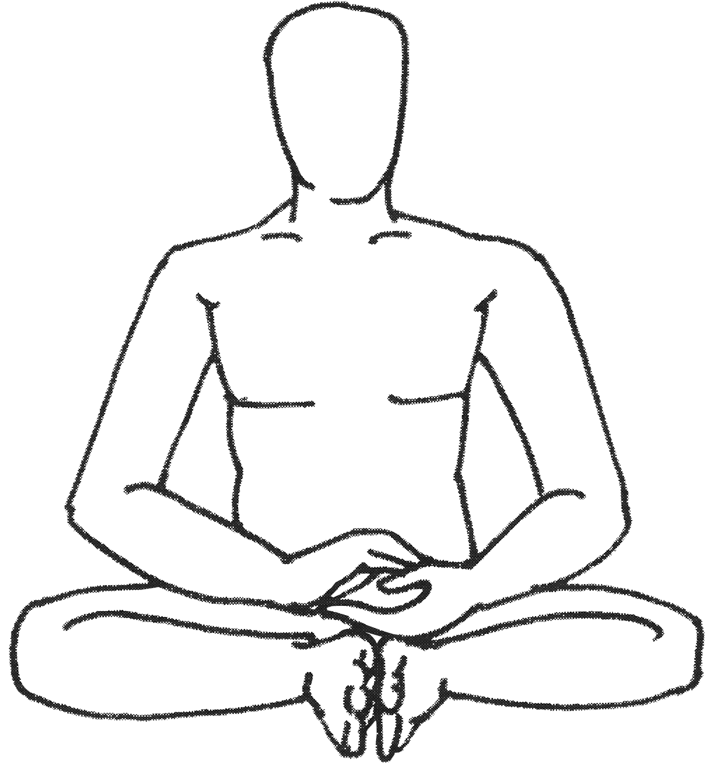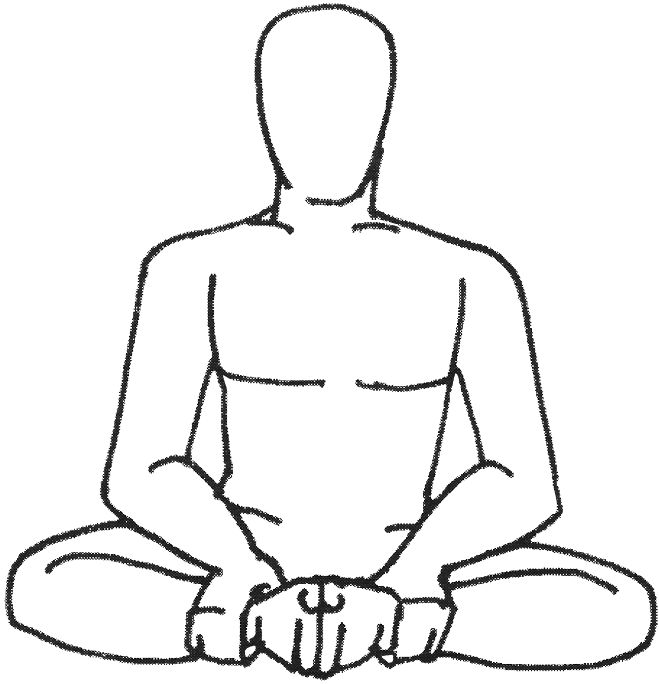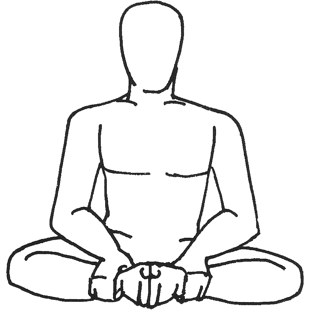 Variante n°1 : Assis au sol, placer les chevilles sous le scrotum de part et d’autre du périnée, la cheville gauche du côté gauche et la cheville droite du côté droit. Tenir fermement les pieds avec les mains. Autres noms : baddhakoṇāsana ou gorakṣāsana (variante n°6). |