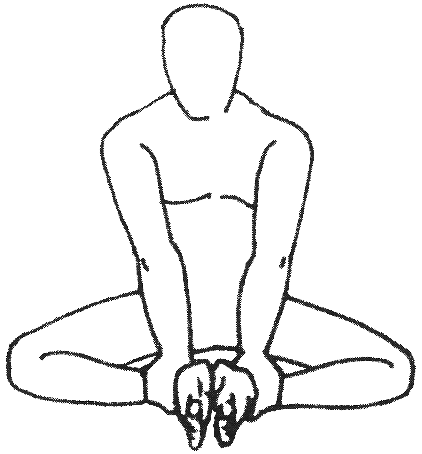 Variante n°6 : Assis au sol, placer les deux pieds, plantes jointes, sous le scrotum. Les mains tiennent les chevilles. |