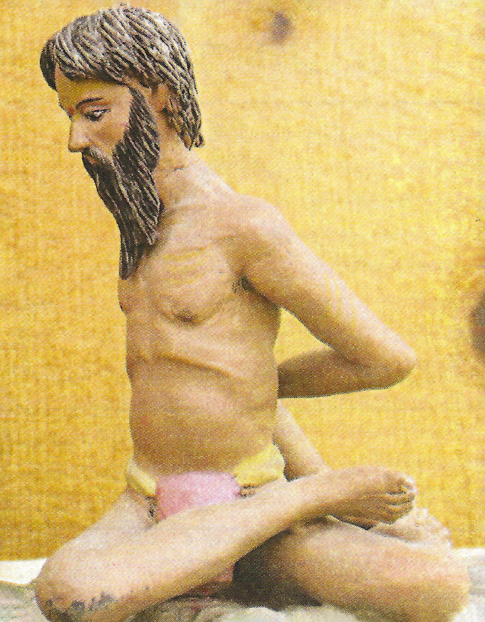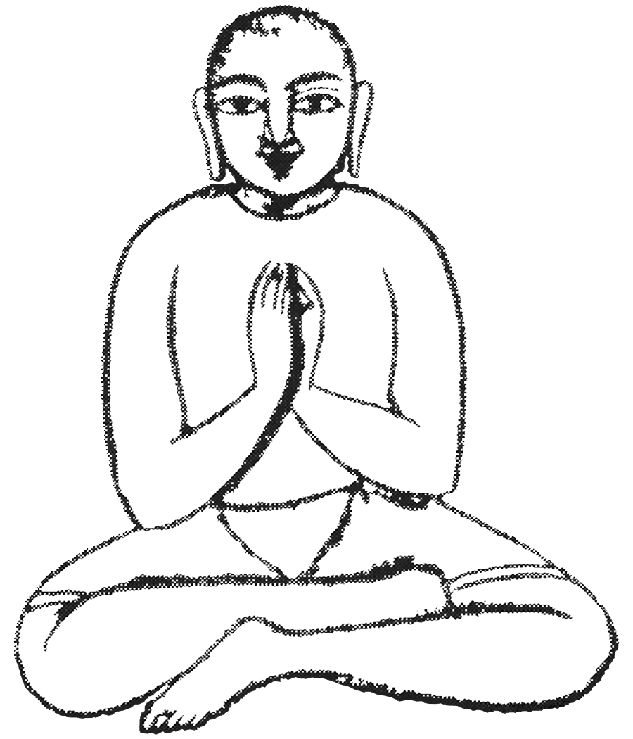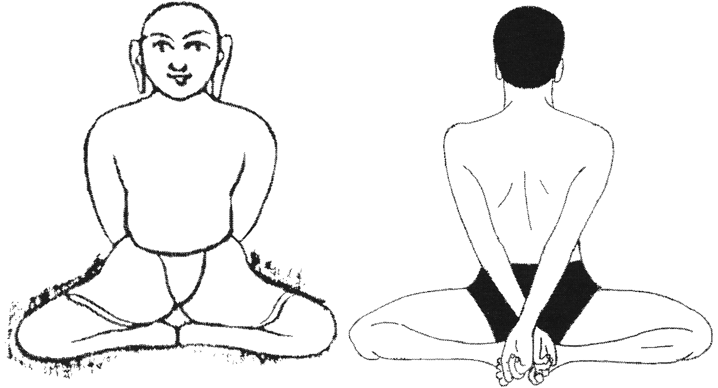 Variante n°8 : Après s’être assis longuement, prendre les chevilles avec les mains et faire toucher les plantes des pieds. Puis, à l’aide des mains placées sous les chevilles, tourner les orteils vers le bas, puis tirer les pieds pour les incliner vers l’avant. Les orteils sont donc maintenant dirigés vers l’arrière. En se penchant légèrement en avant, ajuster les malléoles de part et d’autre du périnée, sans exercer de pression sur le scrotum. Croiser les mains dans le dos et agripper les gros orteils du pied opposé. Puis contracter les muscles de la gorge (jālandhara bandha) et diriger le regard vers le bout du nez. Autre nom : gorakṣāsana (variante n°2). |