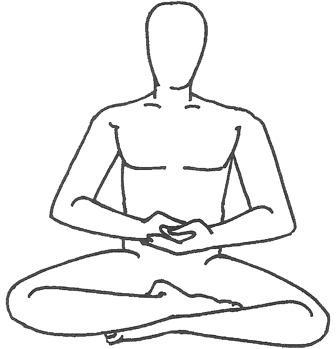 Variante n°10 : Assis au sol, presser le talon droit sur le périnée et positionner le pied gauche sur la cuisse droite. Joindre les mains sur la poitrine en salutation. Diriger le regard vers le nez et se tenir bien droit. |