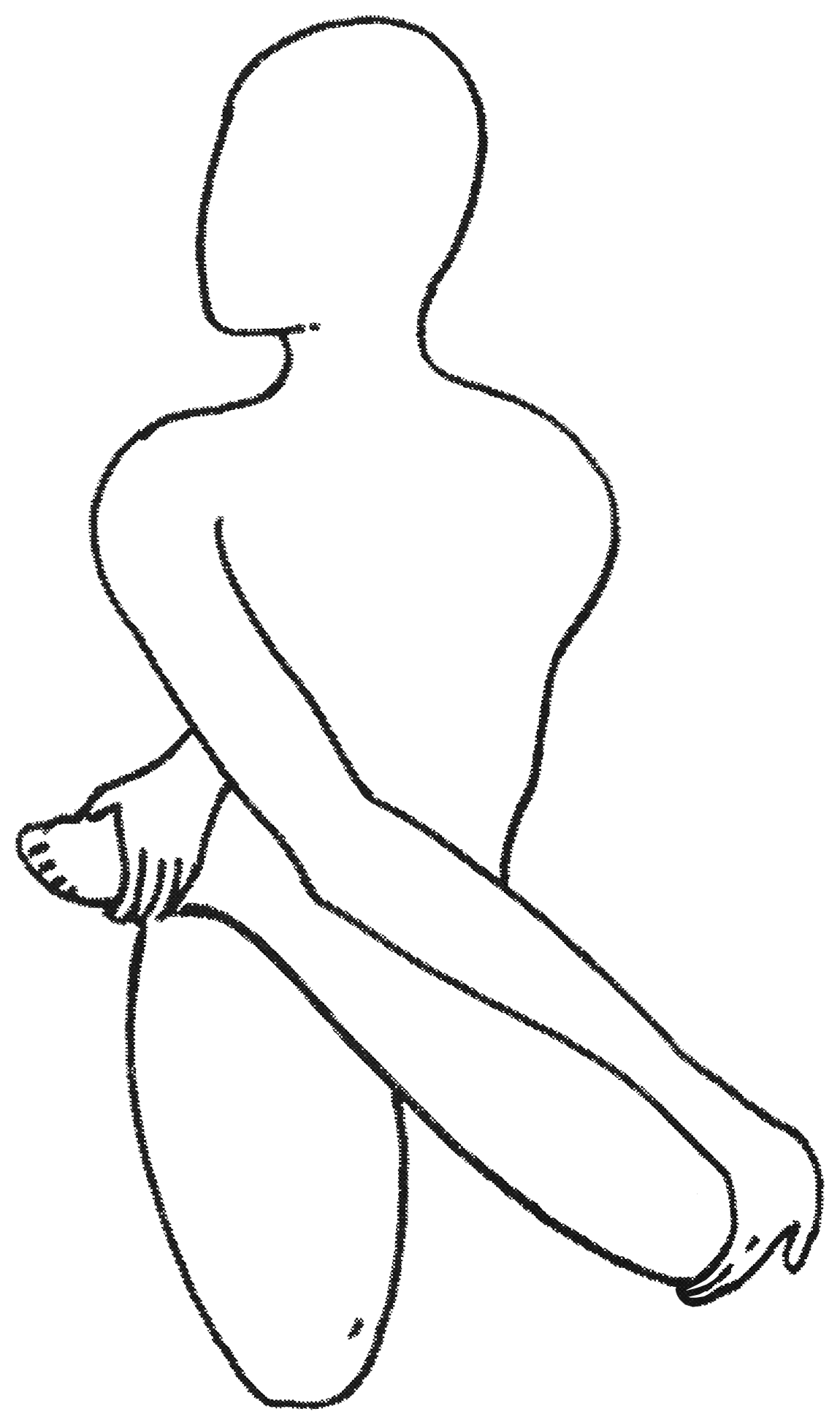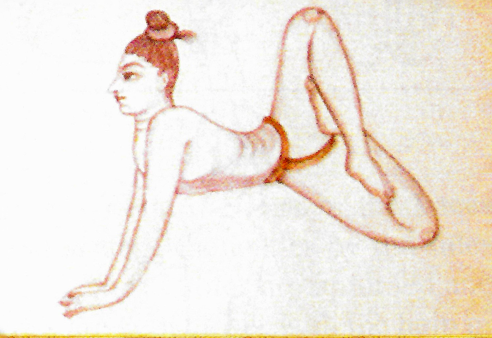 Variante n°1 : Se mettre dans la posture du lotus (padmāsana) et lever les deux jambes croisées vers l’arrière en s’aidant des mains et du genou droit. Les mains restent côte à côte ou l’une sur l’autre. |