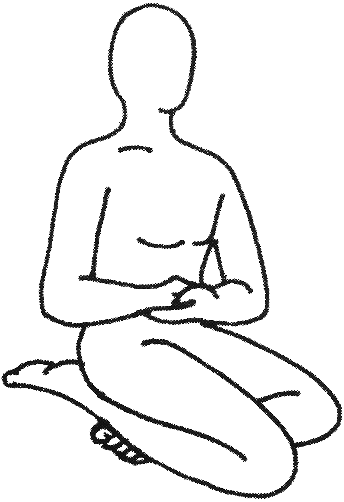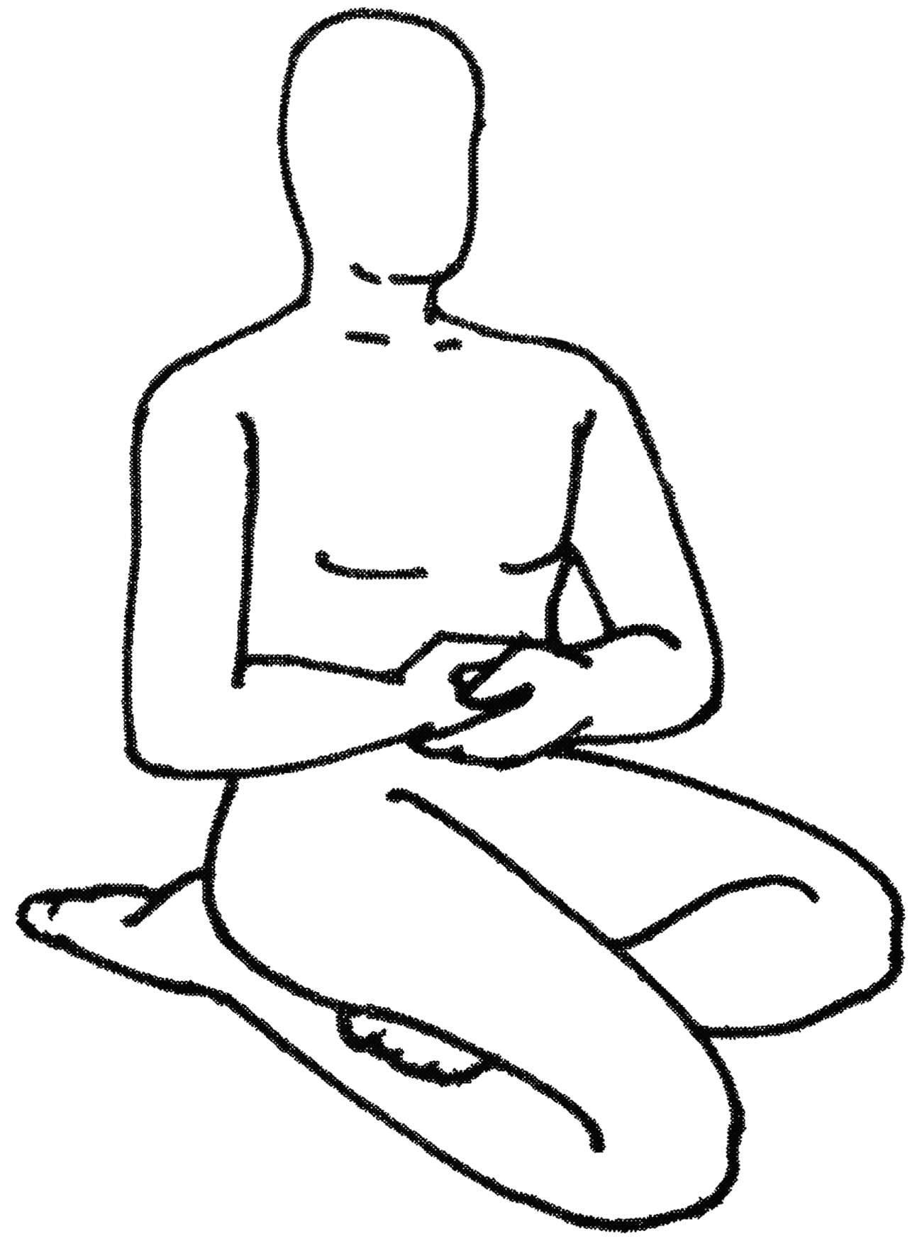 Variante n°1 : Plier la jambe gauche. Puis plier le genou droit et le positionner à une vingtaine de centimètres du genou gauche. Poser la cuisse sur le pied gauche. Mettre les mains en regard au niveau du nombril. Posture symétrique de vāma vakrāsana (variante n°1). |