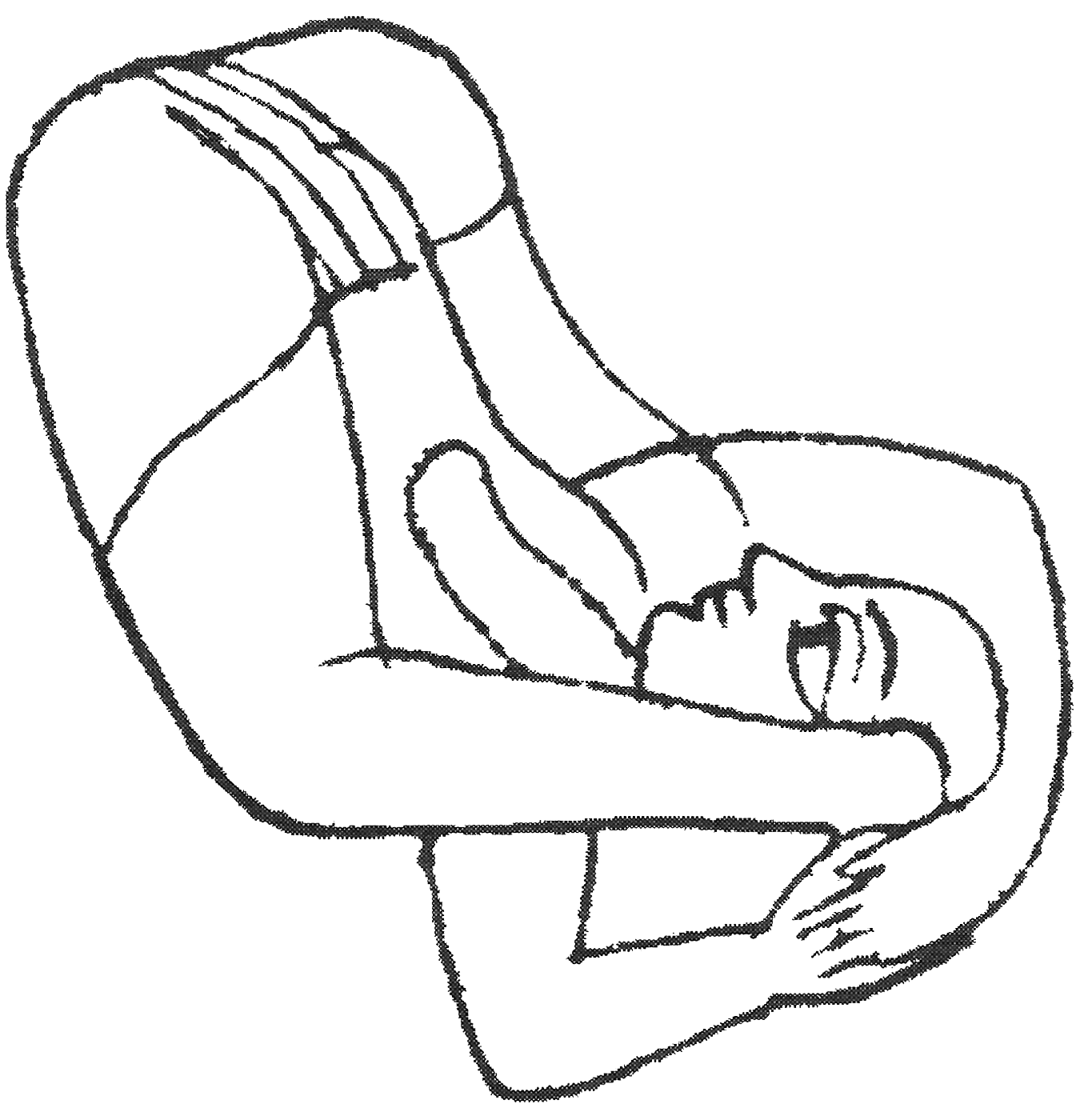 S’allonger sur le dos. Croiser les doigts et saisir les pieds au niveau des chevilles. Toujours allongé sur le dos, amener les pieds au-dessus de la tête. Fixer le regard entre les sourcils. |