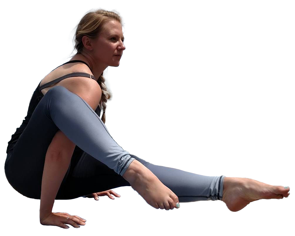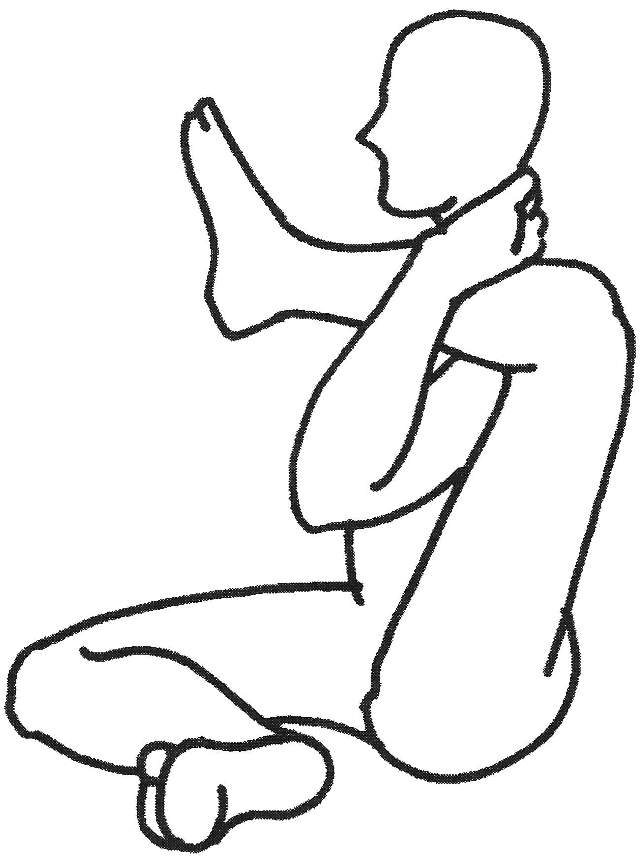 Assis, amener une jambe sur l’épaule du même côté. Croiser les doigts et tenir la jambe avec les mains derrière la nuque. Lorsque les deux pieds sont levés, la posture s’appelle hastabhujāsana. |