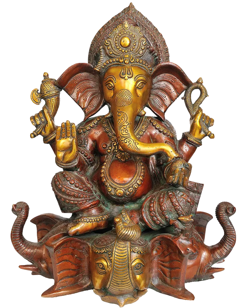 Fils de Śiva et de Pārvatī, celle-ci le façonna en petit garçon à partir de l’écume d’un massage d’huile, et lui donna la vie ; il défendit l’accès de son bain à Śiva, qui de colère lui coupa la tête ; sur la prière de Pārvatī, Śiva lui recolla la tête du premier jeune animal trouvé dans la forêt, qui se trouva être un éléphanteau.