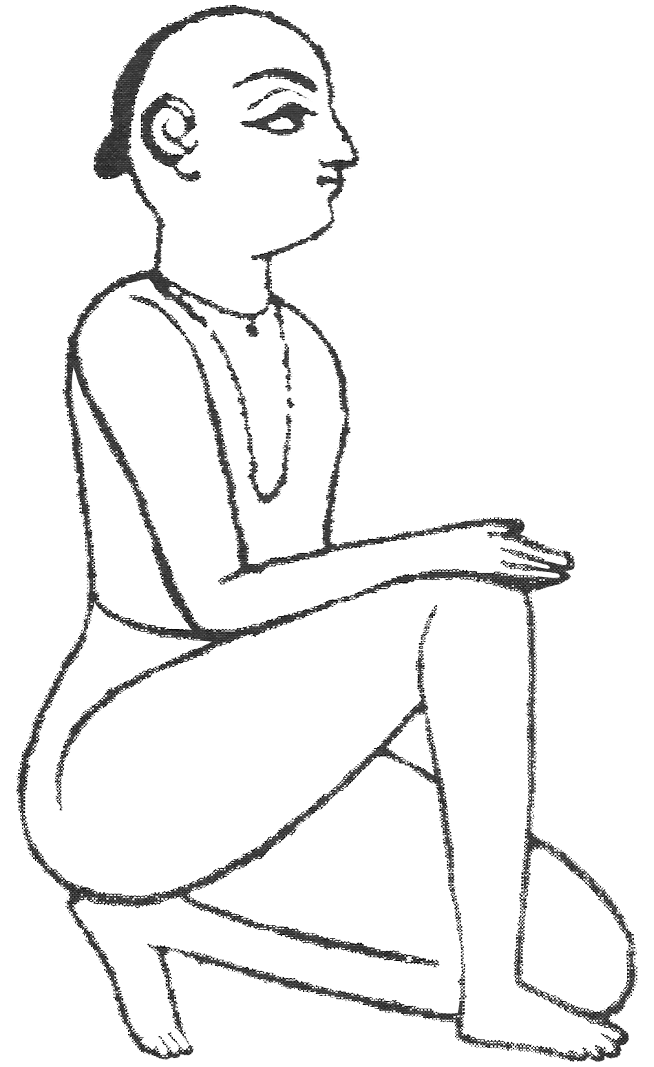 Plier la jambe gauche en équilibre sur la pointe des pieds ; lever le genou droit, la plante du pied restant au sol ; les avant-bras reposent sur les genoux respectifs ; diriger le regard vers le bout du nez. |