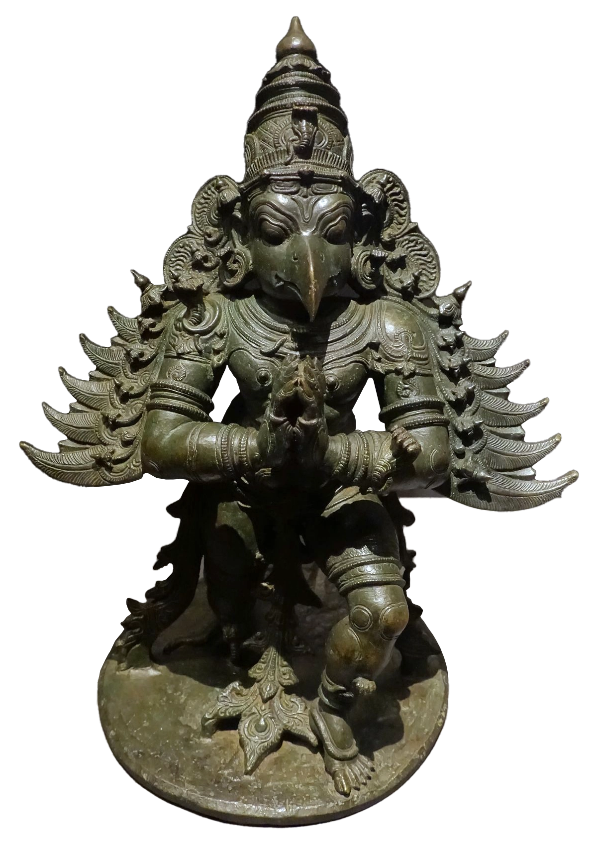 | 5 | Autres noms de Garuḍa : Vainateya (fils de Vinatā), Kaśyapeya (fils de Kaśyapa), Tārkṣya, Suparṇa (au beau plumage), Nāgantaka (qui tue les serpents), Viṣṇu-vāhana (monture de Vishnou), Pakṣirāja (roi des oiseaux), Khageśvara (seigneur qui se meut dans l’air). |