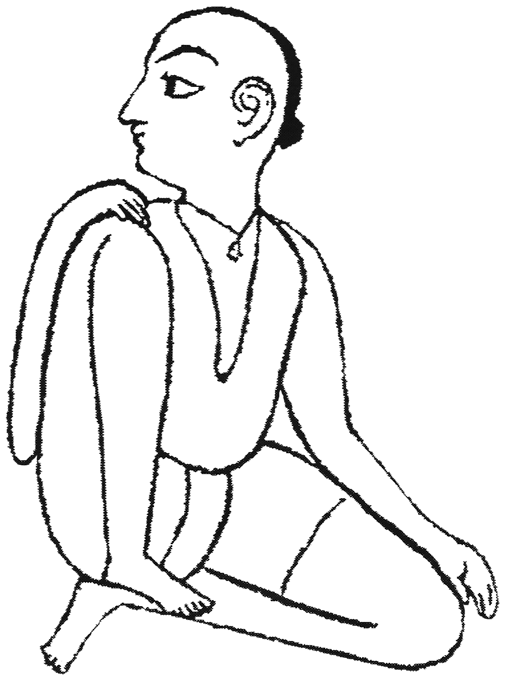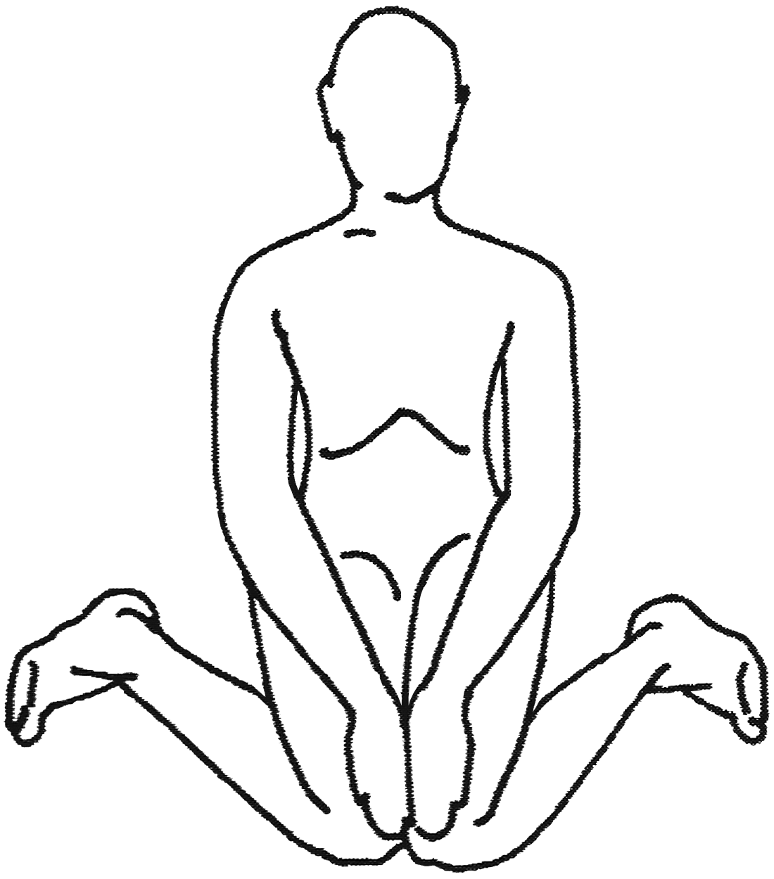 Variante n°3 : S’asseoir par terre. Plier la jambe gauche et coincer sa cheville sous l’anus. Puis placer le pied droit à côté du mollet gauche, le genou bien levé. Reposer les mains sur chaque genou et diriger le regard vers le bout du nez. |