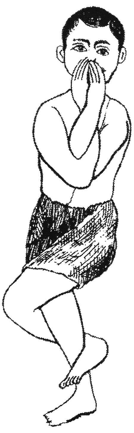 Variante n°4 : Se tenir debout pieds joints. Puis lever le pied gauche, plier un peu le genou droit et croiser la cuisse droite et le pied gauche. Plier un peu plus le genou droit et l’entourer de la jambe gauche. Enrouler les bras et placer les mains sur la bouche. |