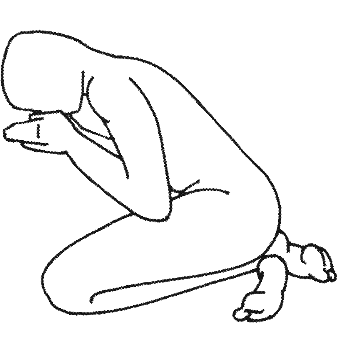 Variante n°5 : Croiser les pieds et s’agenouiller. Les coudes reposent sur les genoux et les mains sont jointes en salutation. Le menton touche la gorge et les yeux fixent le bout du nez. |