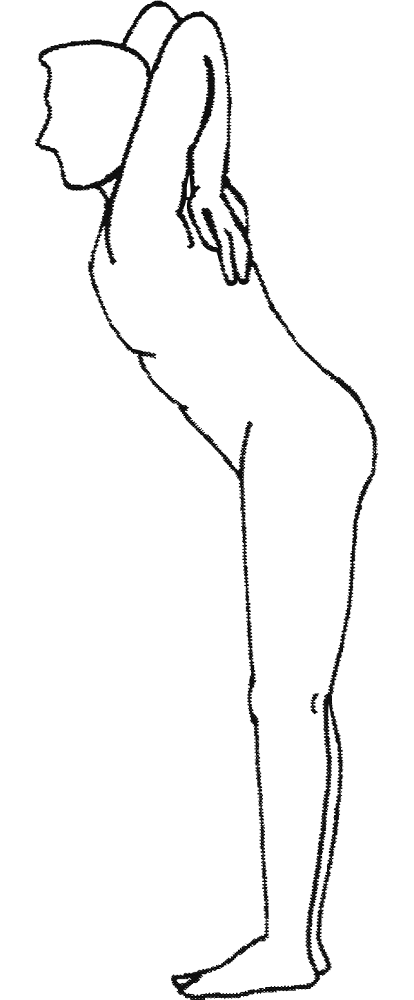 Variante n°6 : Se tenir debout puis pencher le buste en avant. Placer les mains derrière la tête en pliant les coudes. |