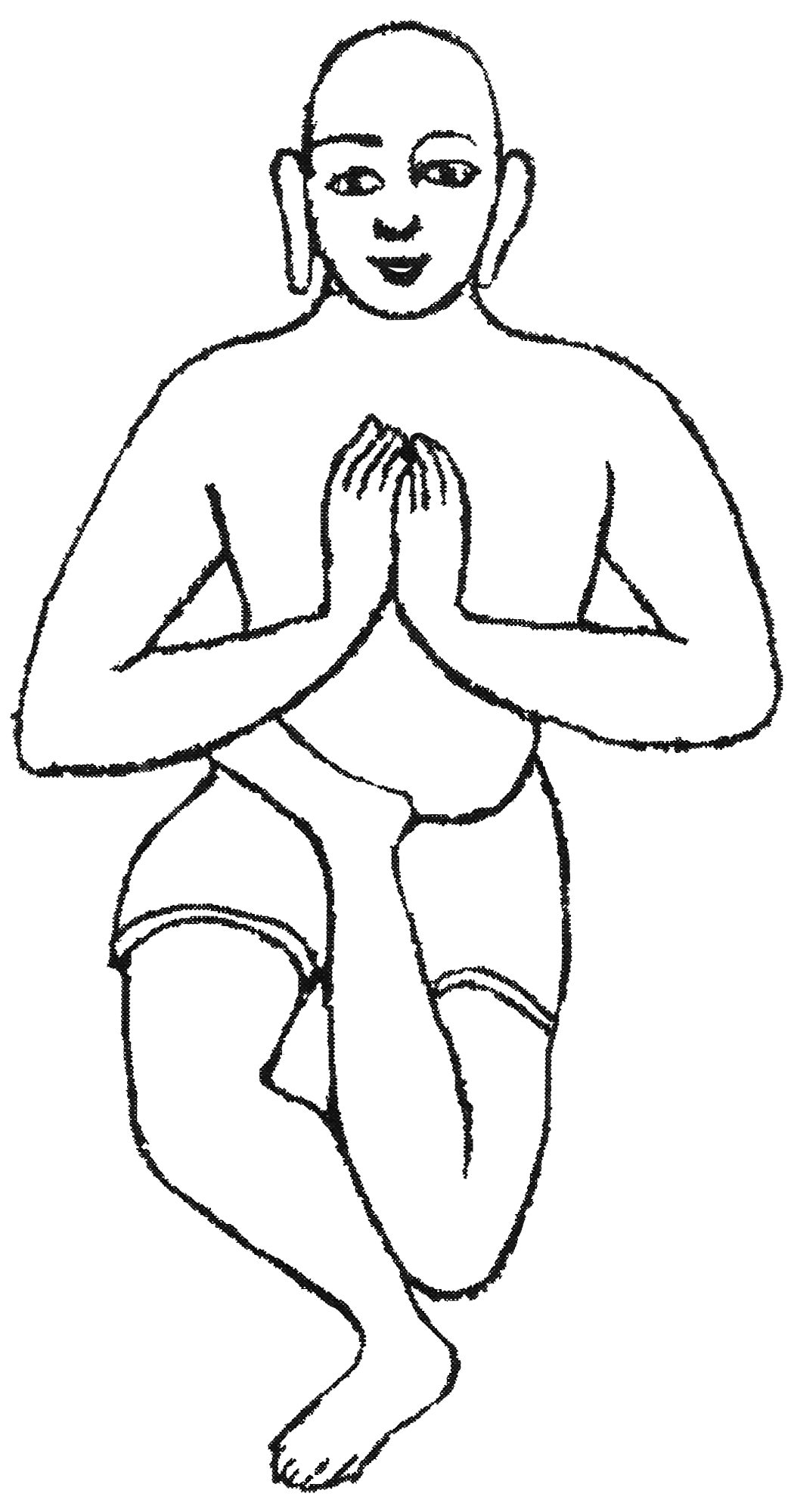 Se tenir bien droit. Lever une jambe et la coincer dans l’aine opposée. En lever le genou pour le mettre au même niveau que le mollet de l’autre jambe en pliant celle-ci. Joindre les mains et les placer sur la poitrine. Autre nom : garuḍāsana (variante n°2). |