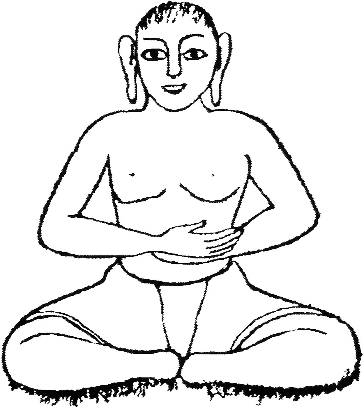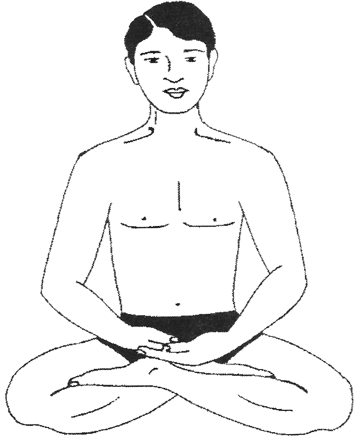 Variante n°1 : Assis en tailleur, tourner les pieds vers le haut entre les genoux et les mollets. Cacher les chevilles avec les mains et contracter la gorge (jālandara bandha), en fixant le regard sur le bout du nez. |