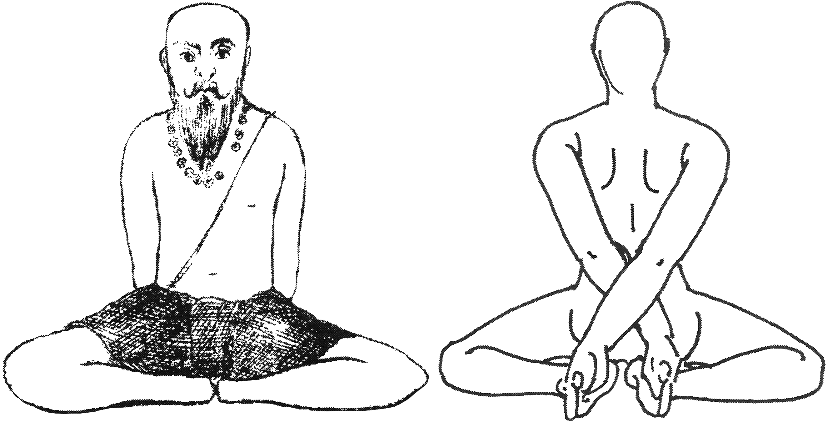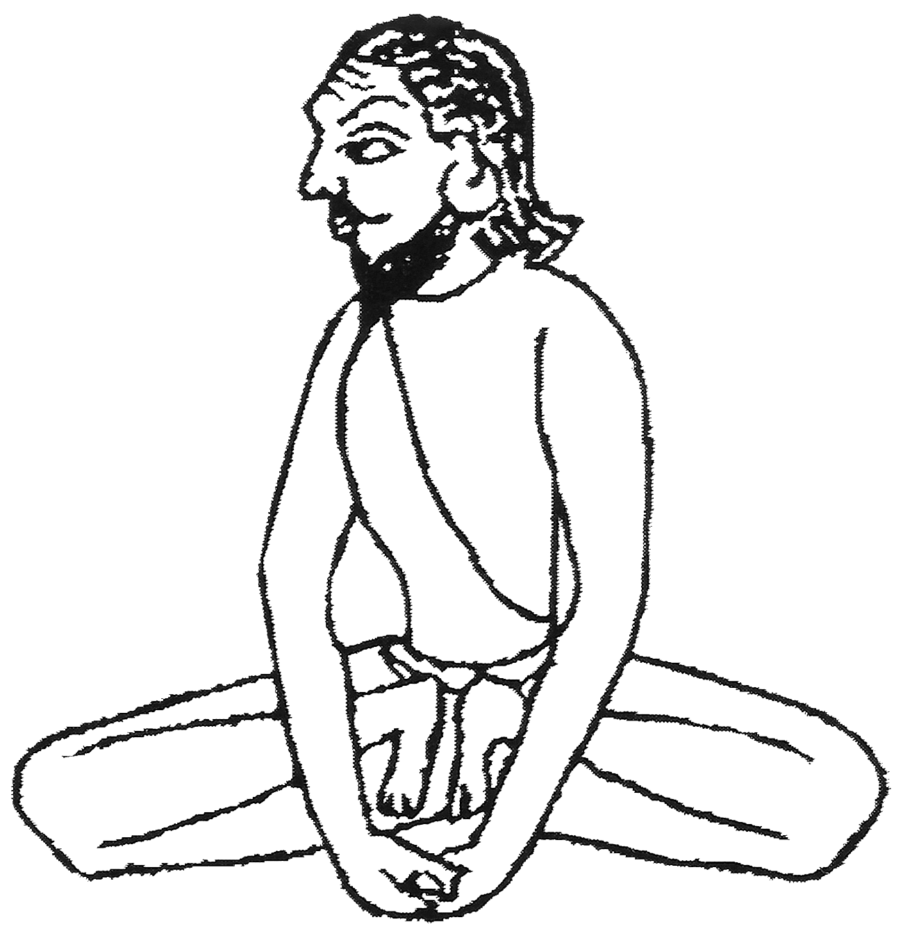 Variante n°2 : Positionner avec soin les chevilles à l’envers sous le scrotum. Croiser les bras derrière le dos et saisir les gros orteils. Contracter la gorge (jālandara bandha), en fixant le regard sur le bout du nez. |