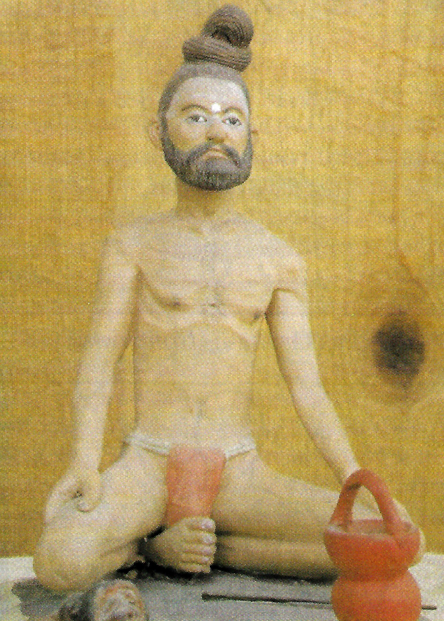 Variante n°6 : Assis au sol, placer les chevilles sous le scrotum de part et d’autre du périnée, la cheville gauche du côté gauche et la cheville droite du côté droit. Tenir fermement les pieds avec les mains. Autres noms : baddhakoṇāsana ou bhadrāsana (variante n°1). |