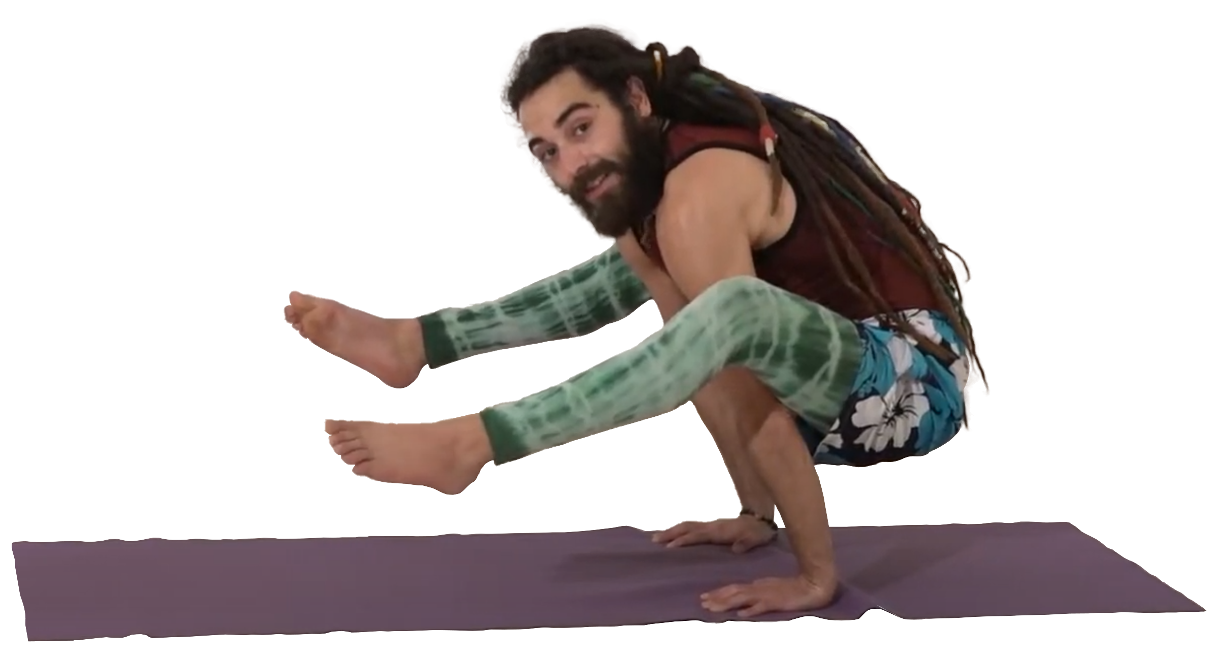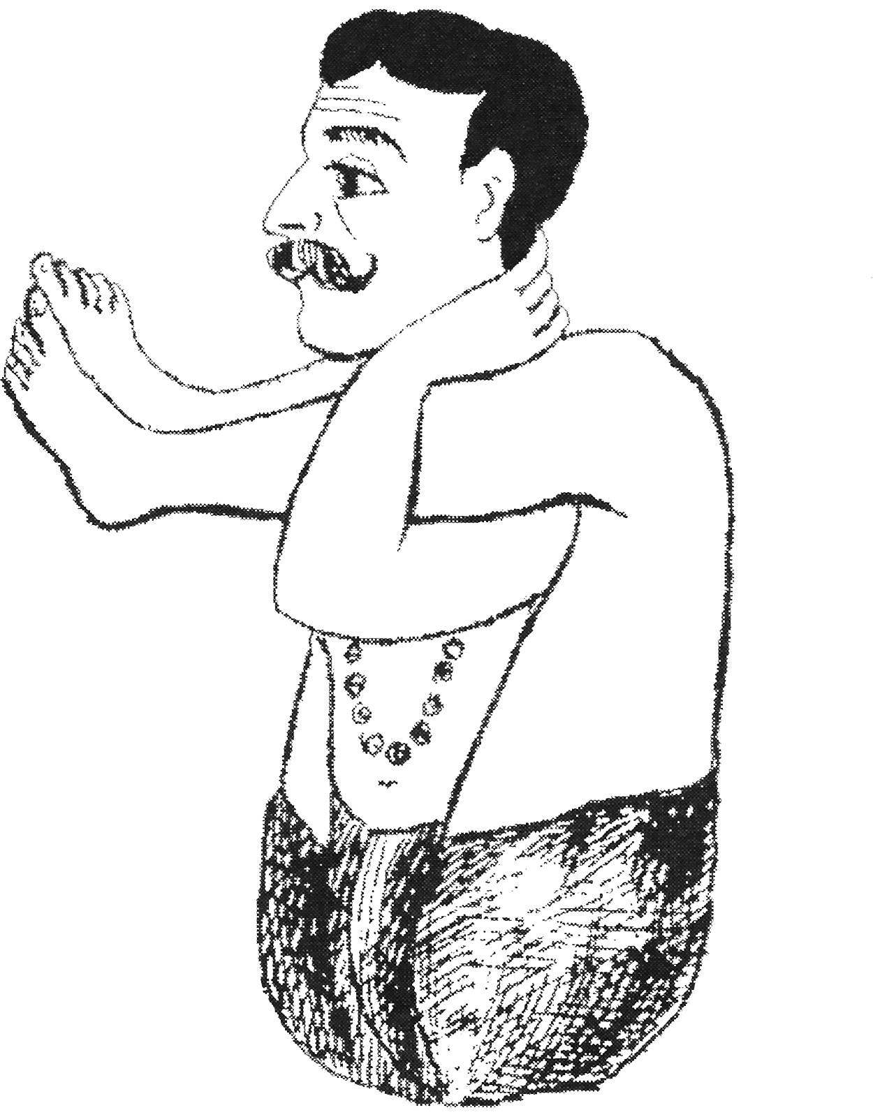 Assis, placer la jambe droite sur l’épaule droite et la jambe gauche sur l’épaule gauche, les pieds projetés en avant. Croiser les doigts et tenir les deux jambes avec les mains derrière la nuque. Lorsqu’un seul pied est levé, la posture s’appelle ekahastabhujāsana. |