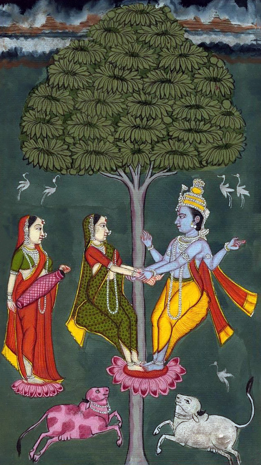 | 1 | कडम्ब kaḍamba ou कदम्ब kadamba (tamoul), nauclea cadamba, est une rubiacée, arbre aux fleurs en globules sphériques denses de couleur orange, très parfumées, éclosant à l'arrivée des pluies. C’est à un kadamba que Kṛṣṇa suspendit les vêtements des bouvières (gopī) qui se baignaient . | ![]() |