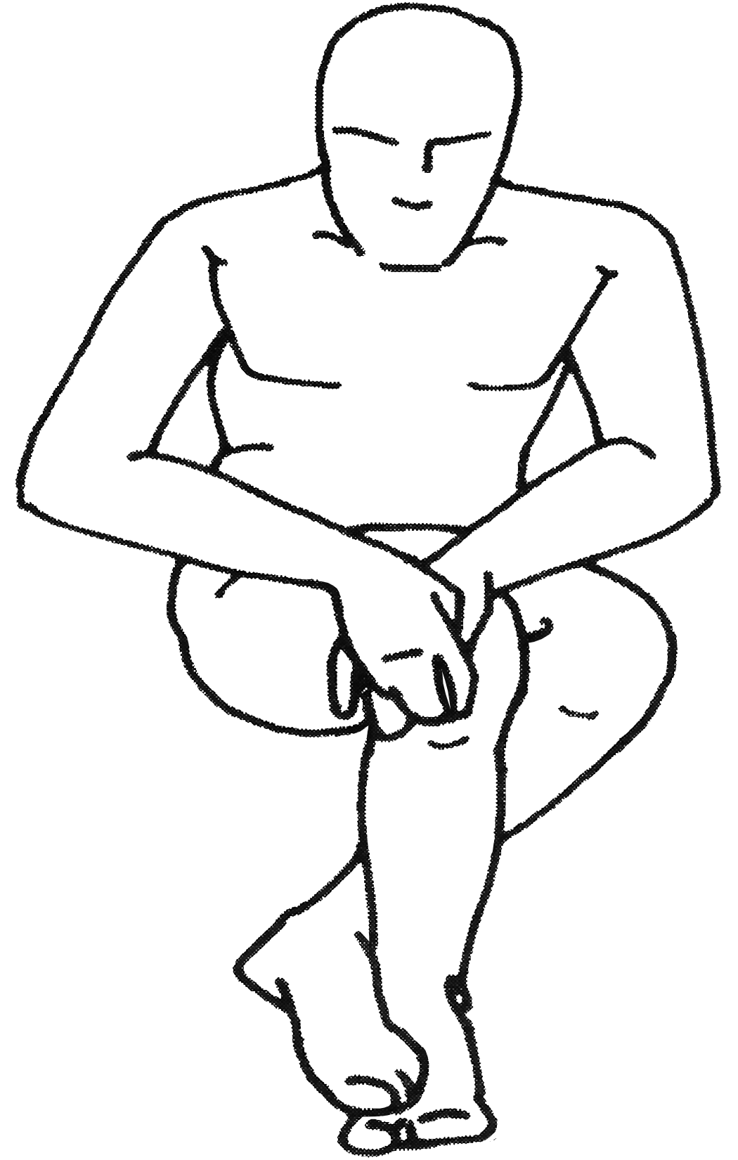 Variante n°2 : Debout, encercler la jambe gauche avec la droite et placer le pied droit sur le gauche et se tenir comme un coq. Placer les deux mains sur les genoux et diriger le regard vers le bout du nez. |