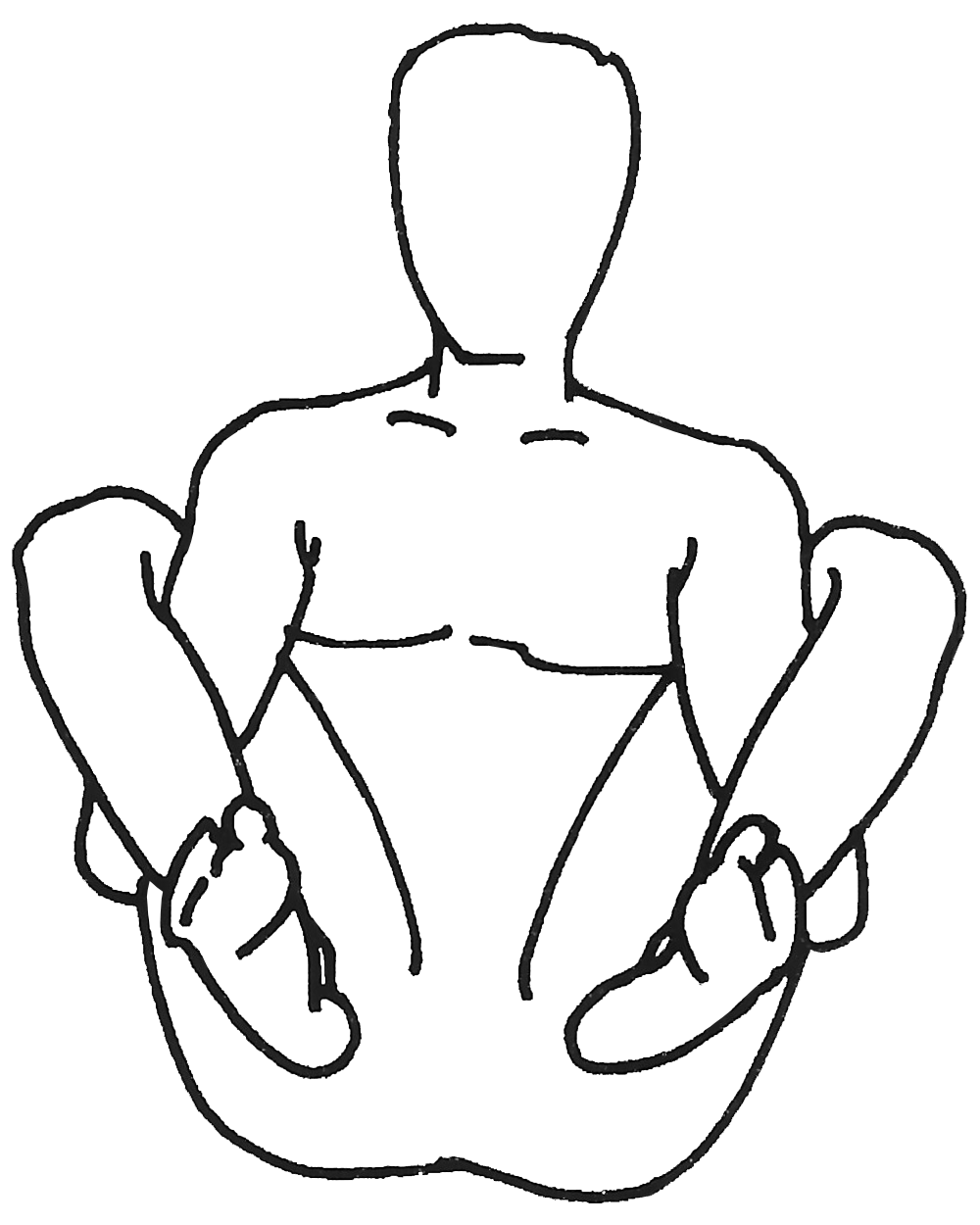 Accroupi, insérer les bras derrière les genoux et, en les tournant vers l’arrière, en bloquer les doigts. Lever les pieds du sol et diriger le regard vers le nez. |