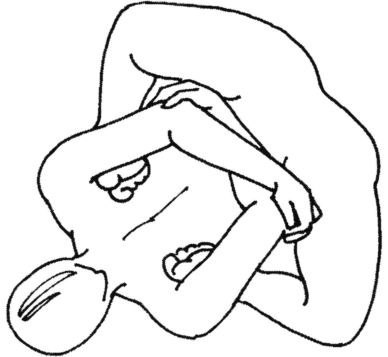 Variante n°1 : Allongé sur le dos, lever les deux pieds et les positionner sous les aisselles, la plante vers le haut. Attraper le coude par la main opposée dans le dos. |